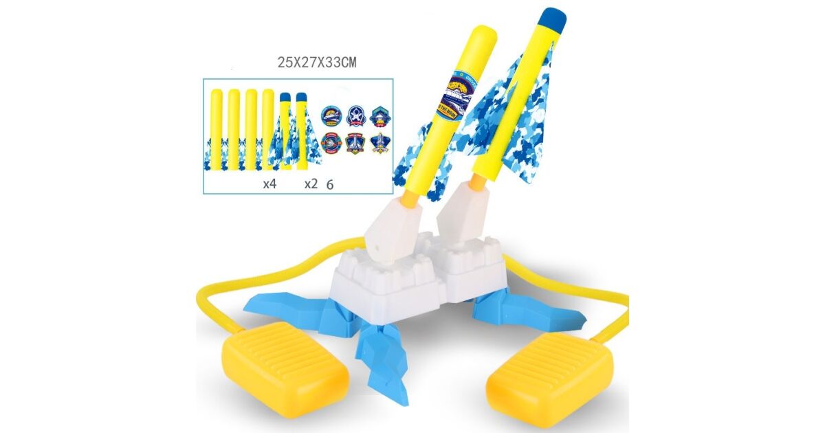 Ezt a terméket így is ismerheted: Gyerekjáték, KeepHome, lábfejű rakétavető, két kilövő, 4 db lámpa nélküli rakéta, 2 db repülőgép, 33x25x27 cm, sárga-kék