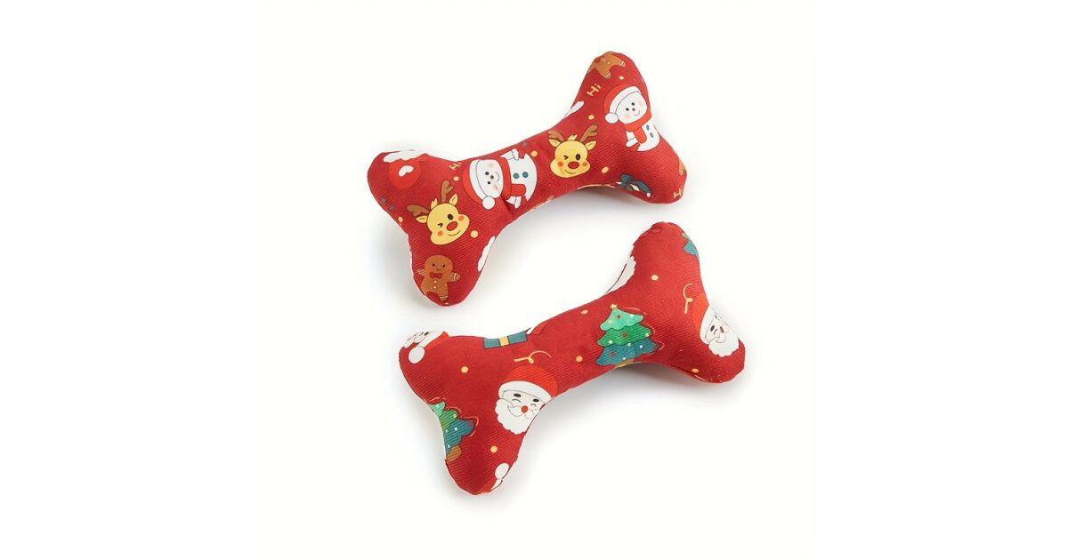 Vidám karácsonyi mintájú, plüssből készült csipogó kutya csontjáték, ami garantáltan feldobja kedvenced ünnepi hangulatát! 🎁