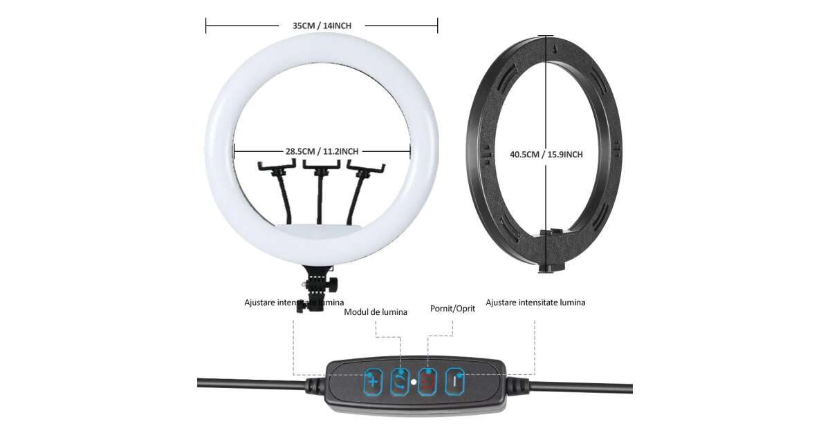 RING LIGHT LED professzionális körlámpa, NEXTLY, átmérő 35cm, 14inch, meleg/hideg/semleges fény, 10 fényfokozat, vezetékes távirányító, 3 telefontartó, 210cm-es állvány.