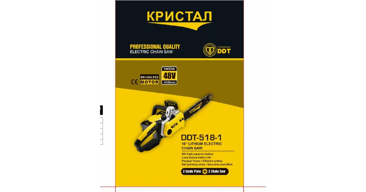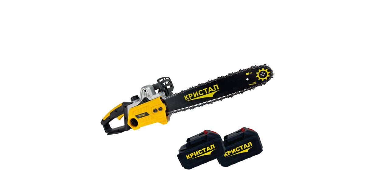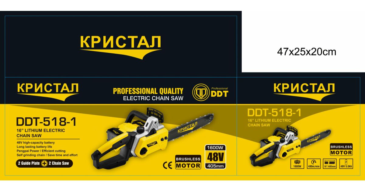 Láncfűrész, mini fűrész 2 akkumulátorral DDT-CRISTAL, 48V, 1600W, 4800ford/perc, 5A, Szénkefe nélküli, Szénkefe nélküli motor, Pengehossz 405mm, 2 penge, 2 lánc, Ideális tűzifa vágásához leírása