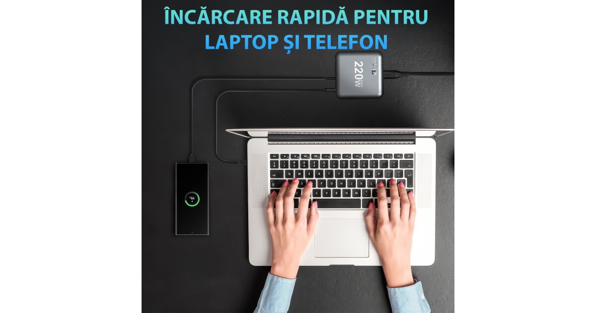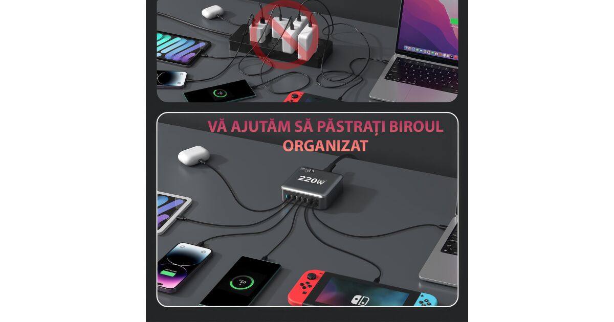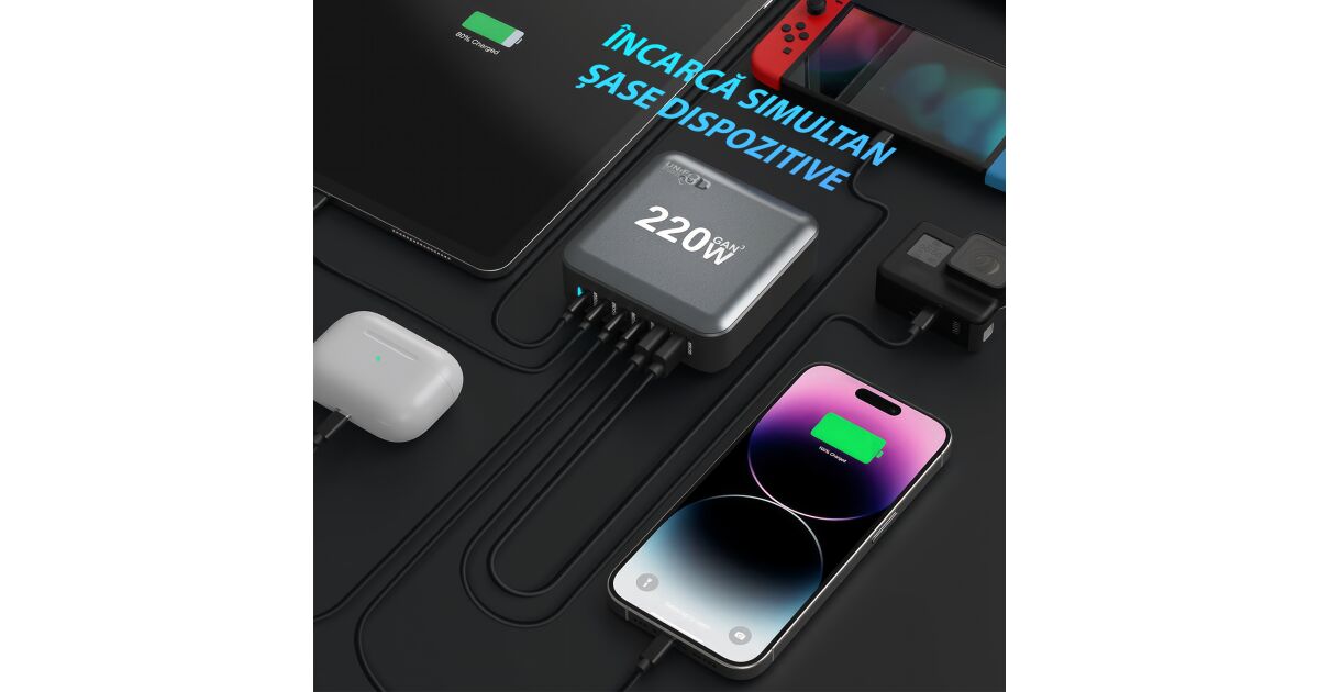 Ezt a terméket így is ismerheted: Stație Încărcare 6 în 1 GaN III – 220W, 4x USB-C + 2x USB-A | Încărcare Simultană Laptop + Telefon | MacBook Pro/Air, Dispozitive Multiple | Negru