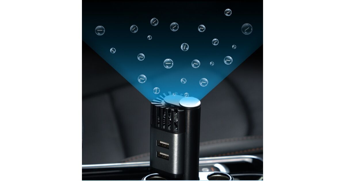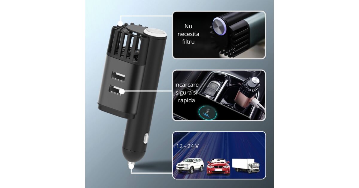Ezt a terméket így is ismerheted: Purificator Auto, 2 in 1, ProClean, negru, 12.1 cm inaltime si 4.8 cm latime, din aliaj de aluminiu si ABS, este rezistent la zgarieturi si uzura, 2 porturi USB pentru incarcare rapida, elimina mirosurile neplacute