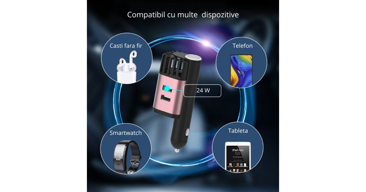 Purificator Auto, 2 in 1, ProClean, rose, 12.1 cm inaltime si 4.8 cm latime, din aliaj de aluminiu si ABS, este rezistent la zgarieturi si uzura, 2 porturi USB pentru incarcare rapida, elimina mirosurile neplacute