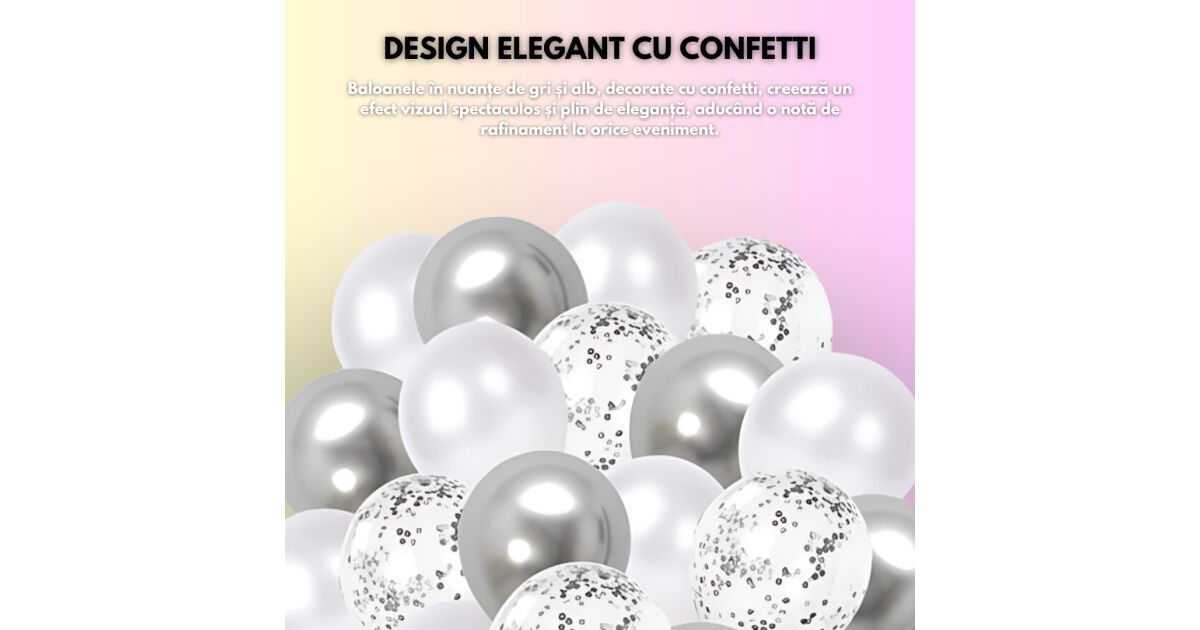 Ez a 15 db-os lufi készlet tökéletes választás születésnapokra, esküvőkre, babavárókra és egyéb ünnepi eseményekre. A szürke, fehér és átlátszó konfettis lufik elegáns és ünnepi hangulatot teremtenek. A fényes felületű lufik gyönyörűen csillognak, és garantáltan feldobják a partit! 🎉