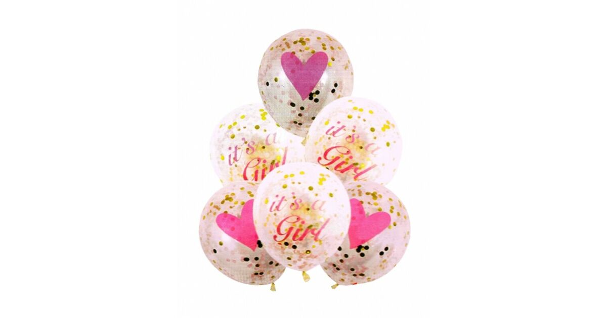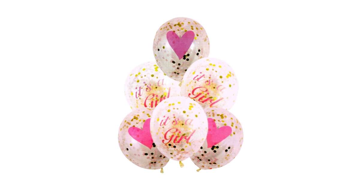 Ünnepeld meg a kislány érkezését ezzel a 6 db-os arany konfetti lufi készlettel! A gyönyörű, átlátszó lufik rózsaszín szívekkel és "It's a Girl" felirattal teszik igazán különlegessé a babaváró bulit vagy a születésnapot. ✨