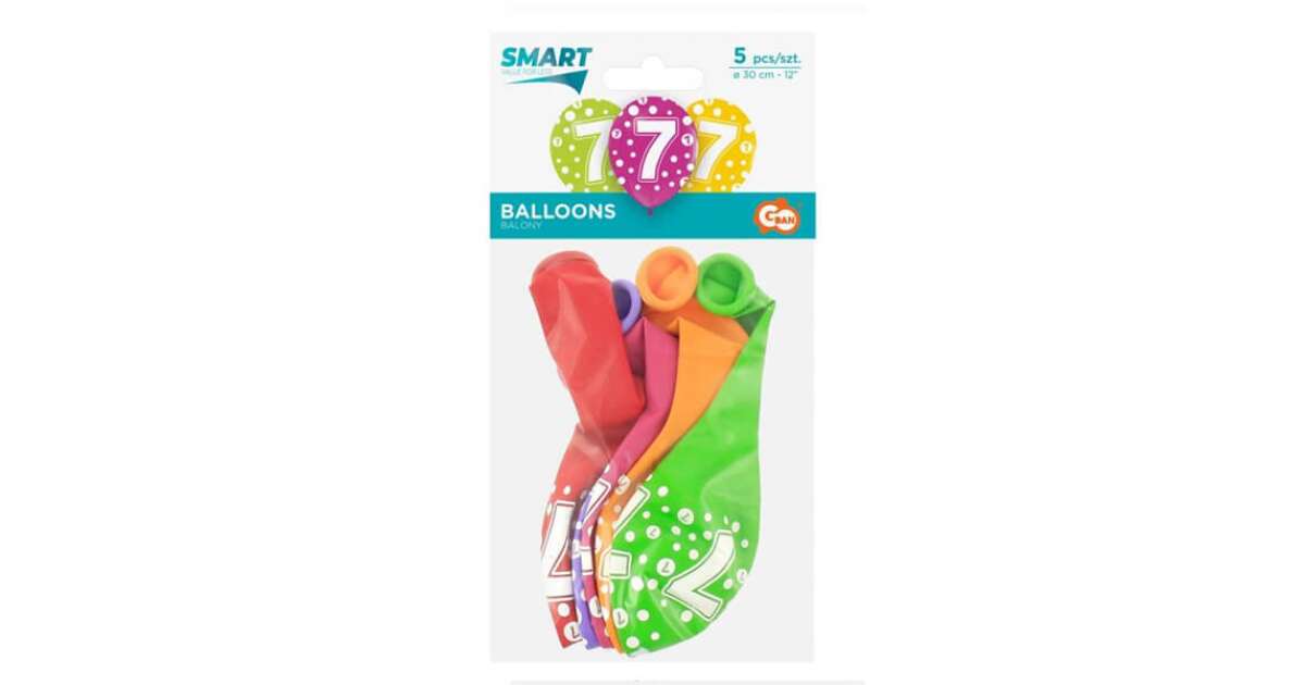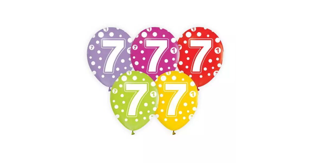 Vidám, színes lufik a 7. születésnapi bulihoz! Ezekkel a pöttyös léggömbökkel garantáltan feldobhatod a parti hangulatát. A csomag 5 db 30 cm-es lufit tartalmaz, vegyes színekben.