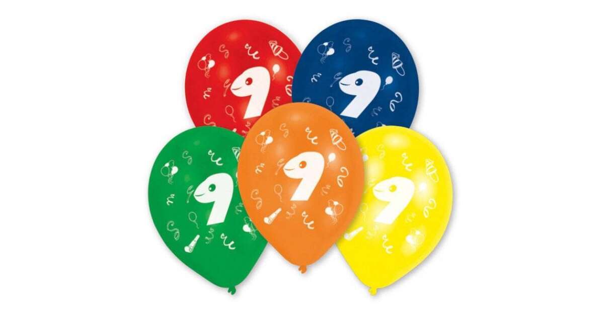 Lepd meg a 9 éves gyerkőcöt ezekkel a vidám, színes lufikkal a születésnapján! A csomag 10 db 25,4 cm-es latex lufit tartalmaz, mindegyiken a 9-es szám és vidám parti motívumok láthatóak.