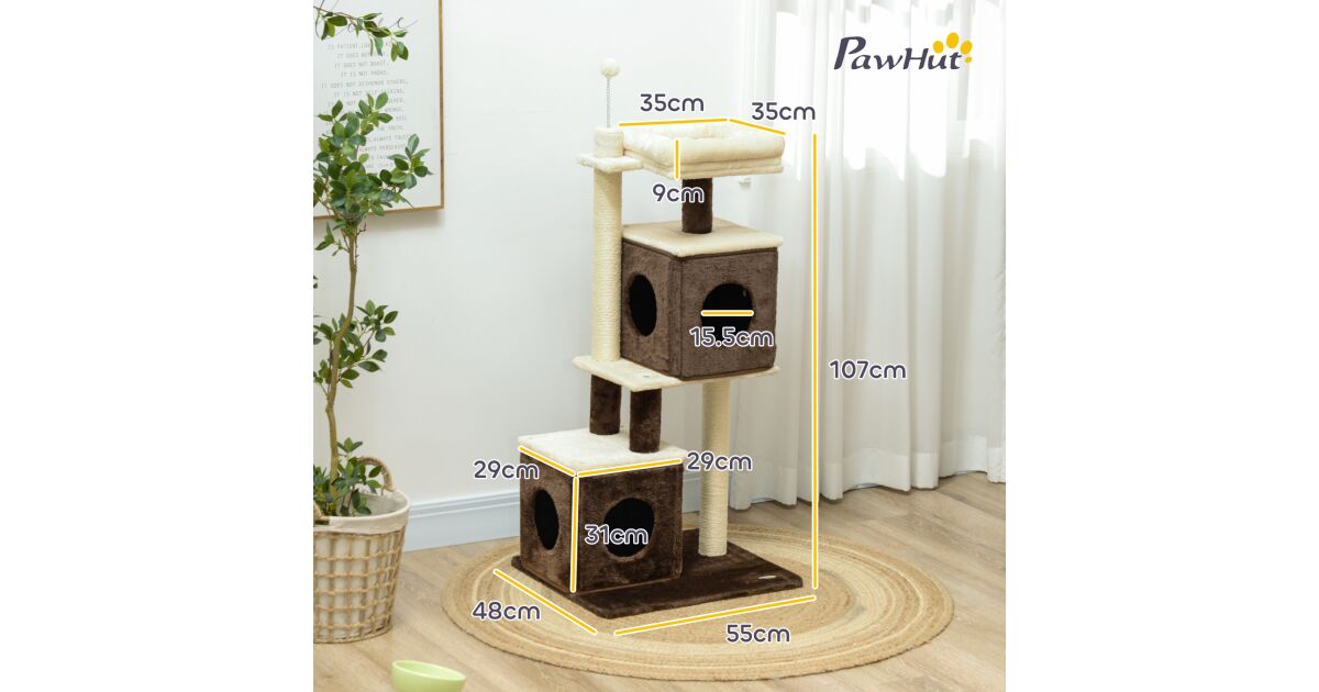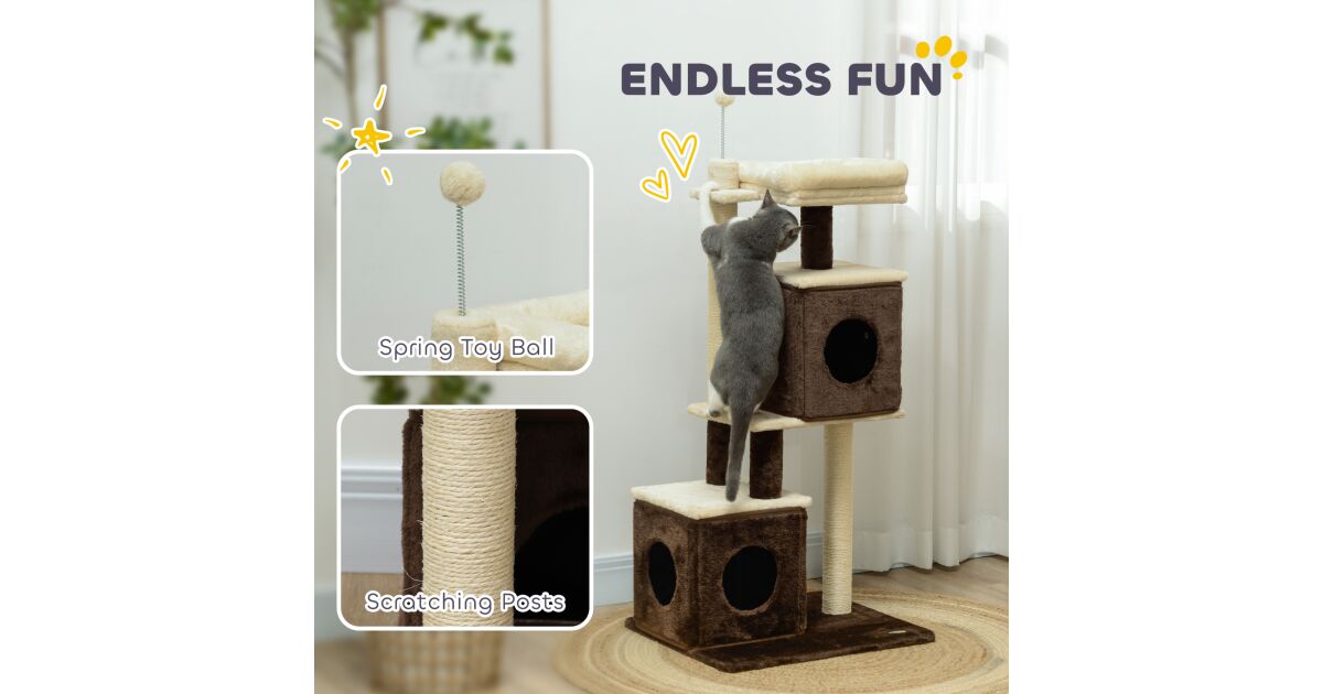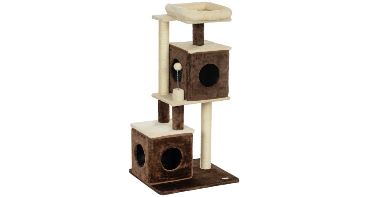 PawHut Macskakaparófa 2 Házikóval, Ágyjal, Ugrálóplatformokkal és Labdával, Fa, 55x48x107 cm
