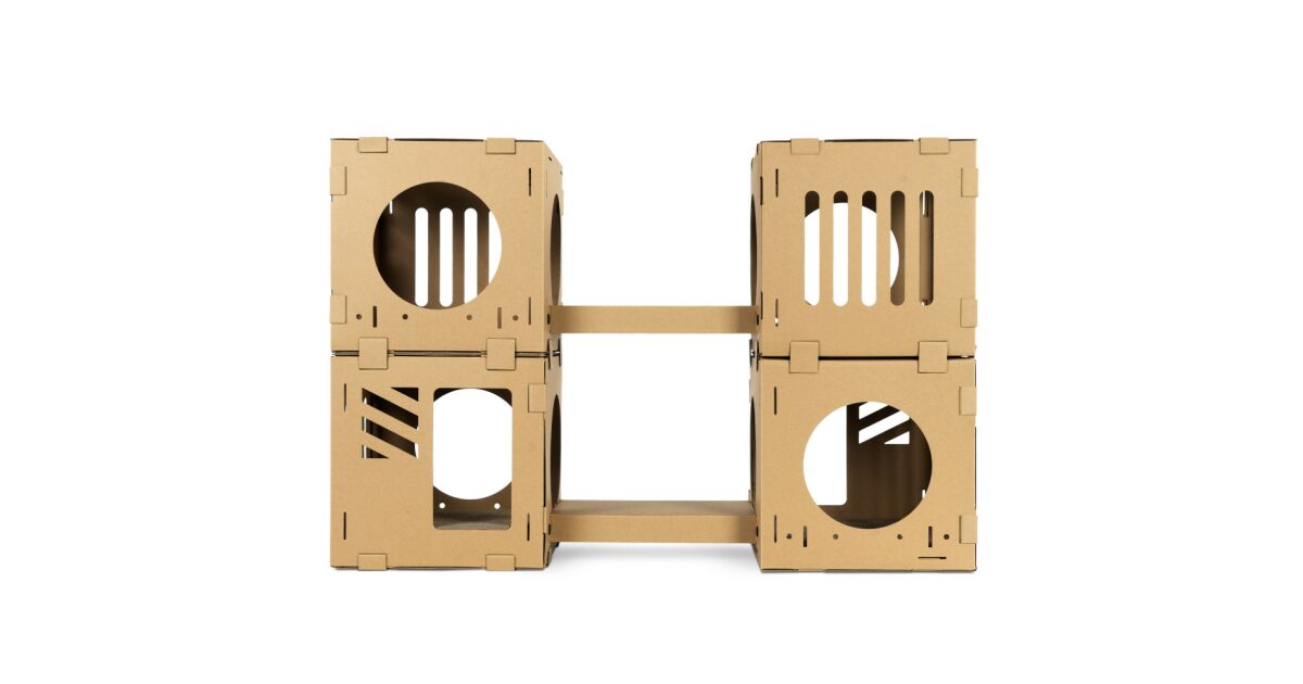 Ez a moduláris karton macskaház egyedi és szórakoztató megoldás kedvence számára! A 4 kocka és 2 polc szabadon variálható elrendezésének köszönhetően könnyedén létrehozhatod a macskád számára tökéletes játszó- és pihenőhelyet. Akár toronyként, akár alagútként is összeállítható!