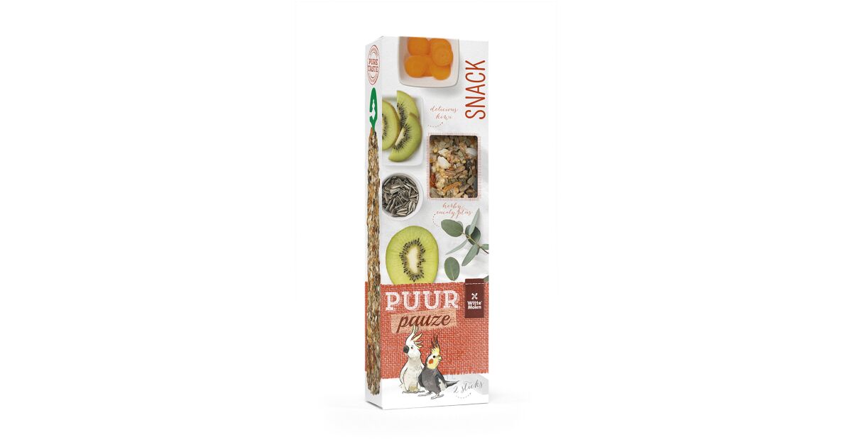 Lepd meg kedvenced, a kakadudat, a Witte Molen Puur Pauze rudakkal – egy ízletes és egészséges csemegével, ami kifejezetten az ő igényeire lett tervezve! Ezek a rudak kiváló minőségű, természetes összetevőkből készülnek, tartósítószerek, színezékek és mesterséges aromák nélkül. A kivi és eukaliptusz egyedi kombinációja nem csak finom, de fontos tápanyagokat is biztosít.