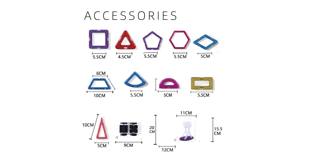 - 148 színes darab, változatos geometriai formákkal, órákon át tartó játékhoz.