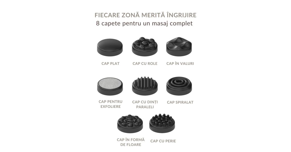 A gép 8 különböző fejjel van felszerelve, amelyek lehetővé teszik a test minden területének - hát, combok, karok, arc, has, lábak vagy sarok - masszírozását. Ezenkívül egy védőfedéllel is rendelkezik, így biztonságban tarthatja, vagy könnyedén magával viheti bárhová, ahol szüksége van rá.