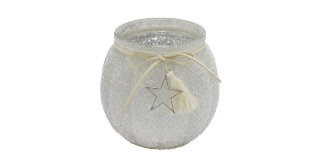 Ez a gyönyörű, havas üveg mécsestartó tökéletes választás az otthonod ünnepi dekorációjának kiegészítésére. A csillagdísszel és a finom fonott szalaggal díszített mécsestartó varázslatos hangulatot teremt, és kellemes fényt áraszt a szobában. A 11,5x11,5x11 cm-es mérete ideális asztaldísznek vagy ablakpárkányra helyezve is.