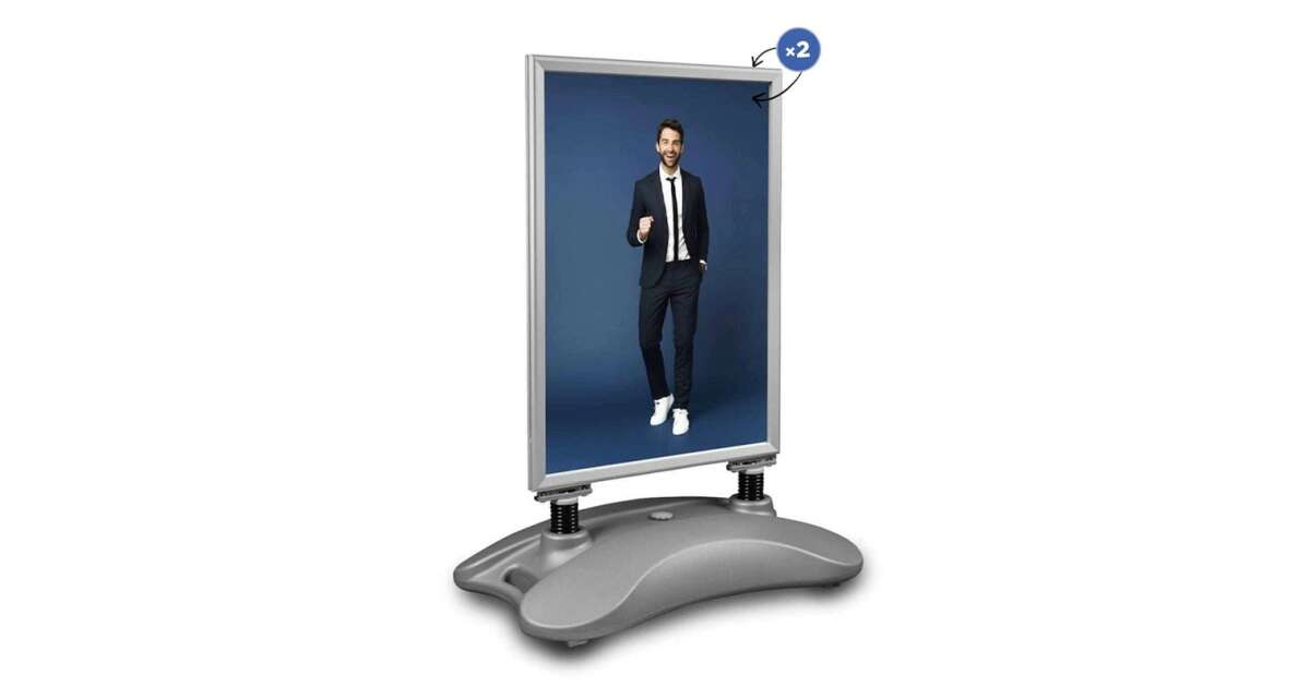 Ez a kültéri információs tábla ideális megoldás A1-es méretű reklámanyagok megjelenítésére. Strapabíró, időjárásálló kialakításának köszönhetően bármilyen időjárási körülmény között tökéletesen használható. A rugós mechanizmusnak köszönhetően a tábla alkalmazkodik a szélhez, így megakadályozza a károsodást.