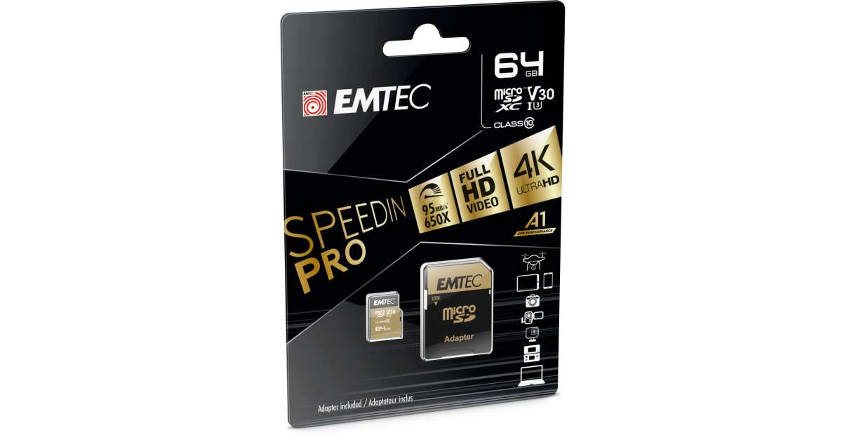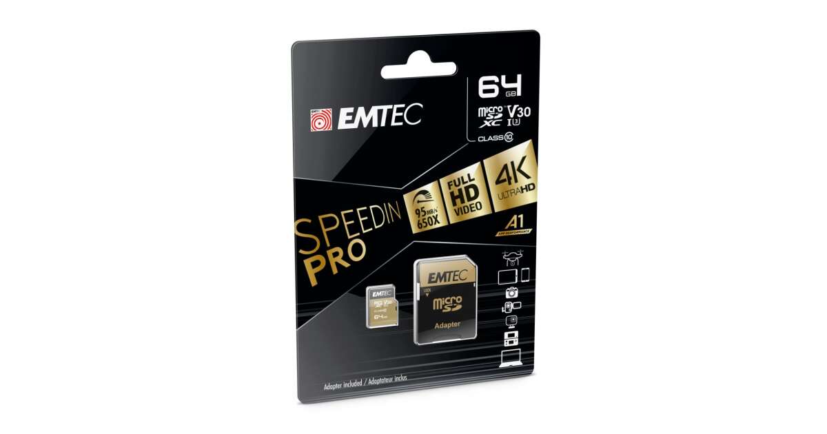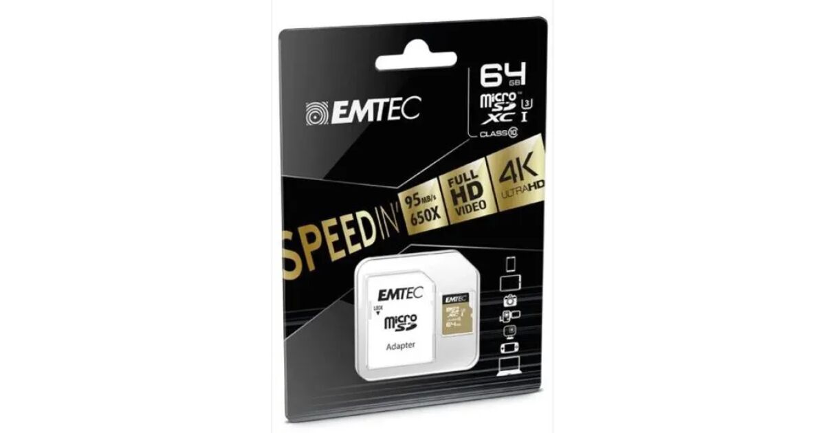 Ezt a terméket így is ismerheted: EMTEC Memóriakártya, microSDXC, 64GB, UHS-I/U3/V30/A2, 100/95 MB/s, adapter, EMTEC "SpeedIN"