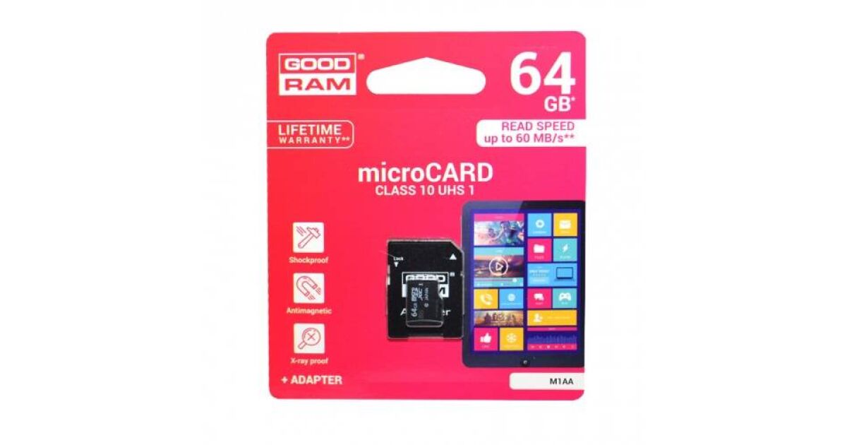 Ezt a terméket így is ismerheted: GOODRAM MEMÓRIA KÁRTYA TransFlash 64GB - microSDHC, Class 10, UHS-i 1, írási sebesség 20 Mb/s, olvasási sebesség 100 Mb/s, + SD adapter - M1AA-0640R12 - GYÁRI