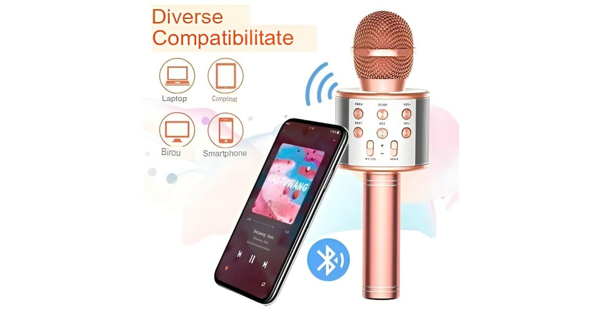 Karaoke mikrofon, KeepHome, gyerekeknek, Bluetooth, beépített hangszóró, bármilyen okostelefonnal kompatibilis, beépített akkumulátor, többfunkciós, rózsaszín arany leírása