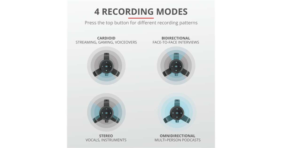 Ez a sokoldalú mikrofon ideális választás streamelőknek, podcaster-eknek és hangfelvételek készítéséhez. Négy különböző felvételi móddal rendelkezik, így mindig megtalálod a tökéletes beállítást. A beépített vezérlőkkel könnyedén szabályozhatod a hangerőt és a mikrofon némítását. A stabil tripodszerkezet biztosítja a mikrofon biztonságos elhelyezését.