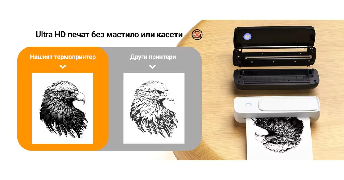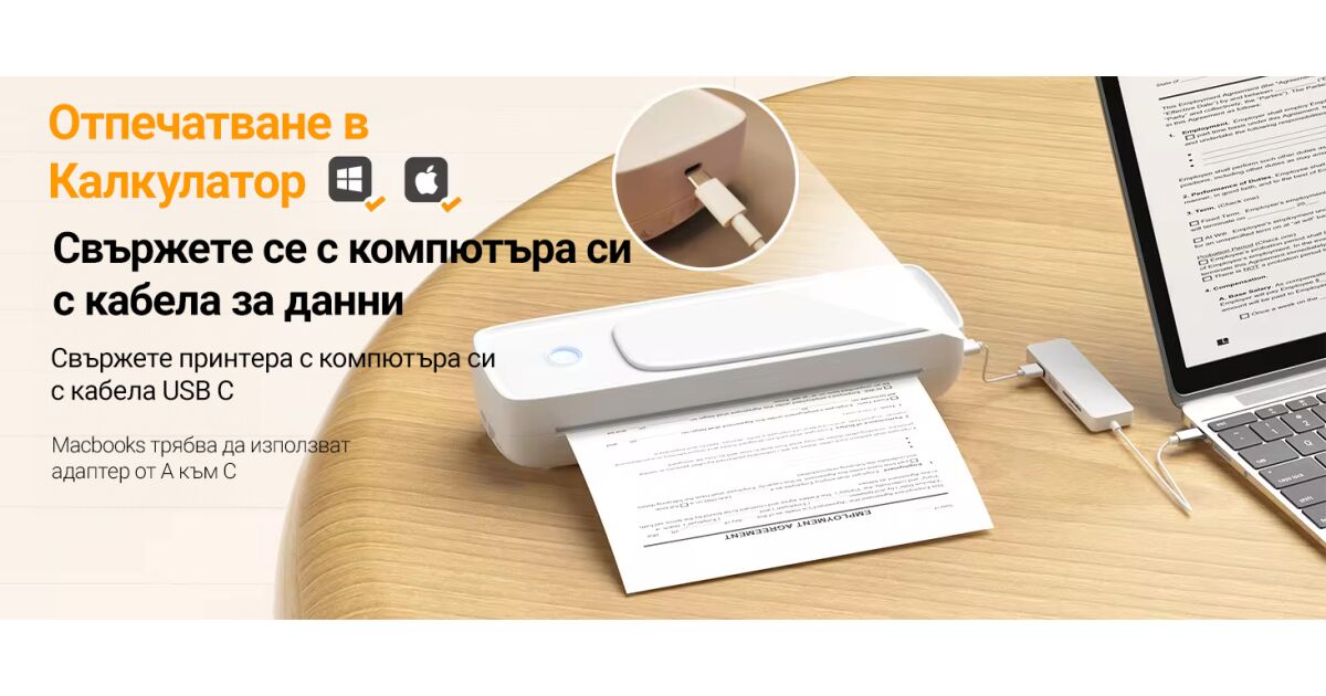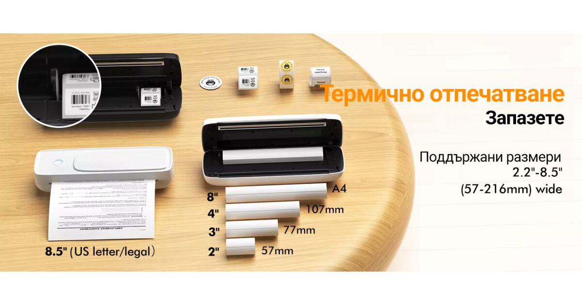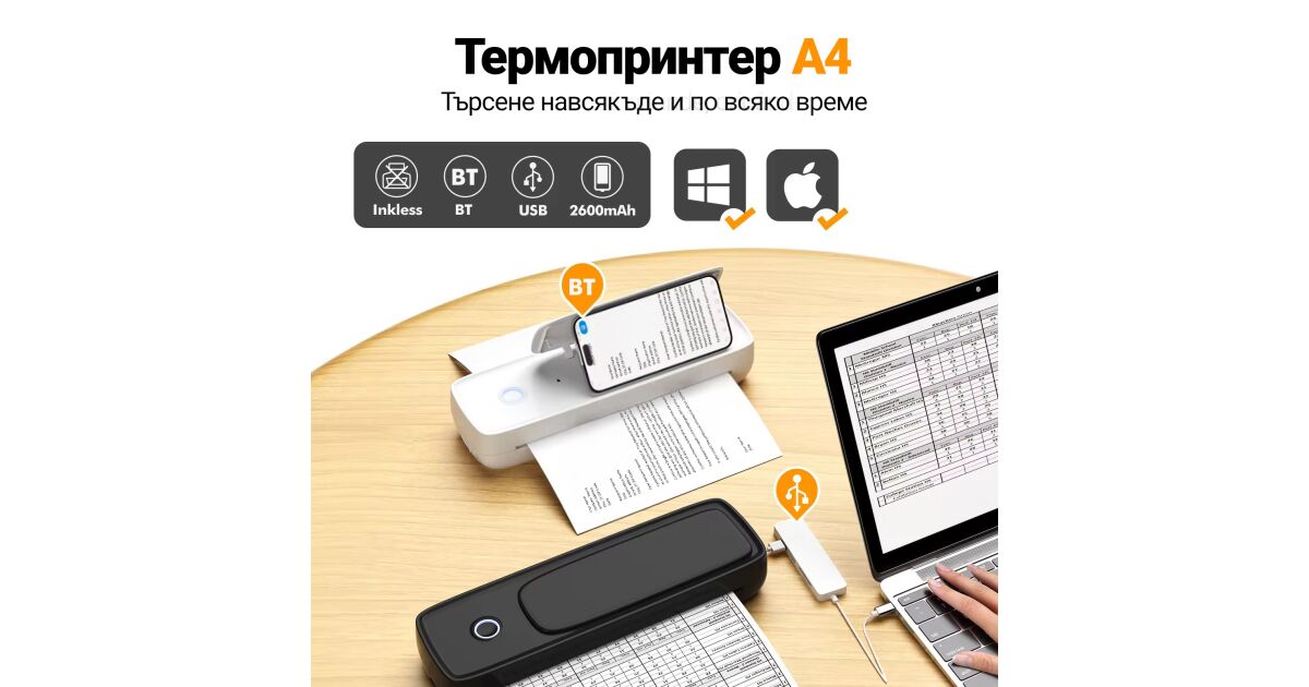 Termikus nyomtató, Ultra modell, hordozható, vezeték nélküli, nem igényel ecsetet, A4-es formátumig támogatja, Bluetooth, USB, iOS / Android / Windows / MacOS kompatibilis, 2600 mAh akkumulát