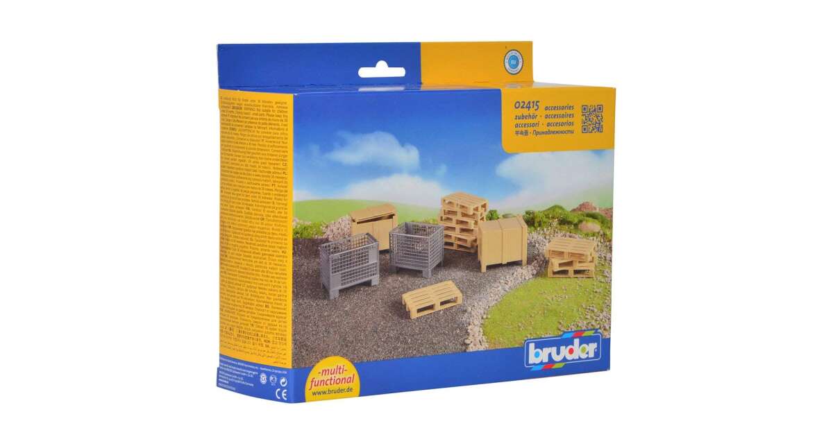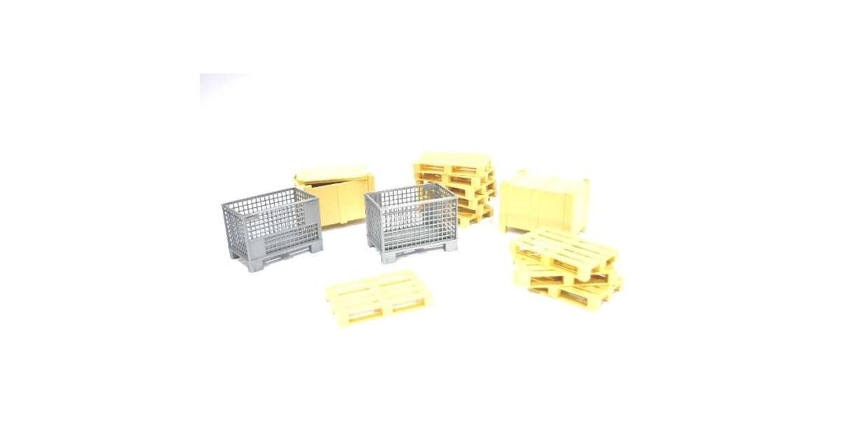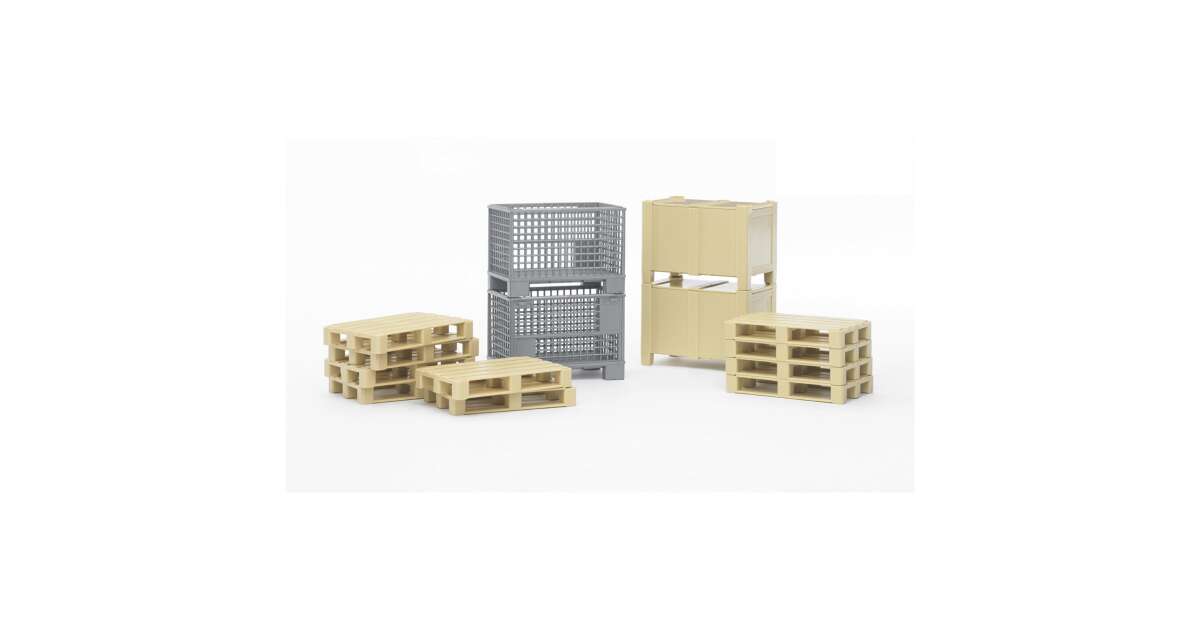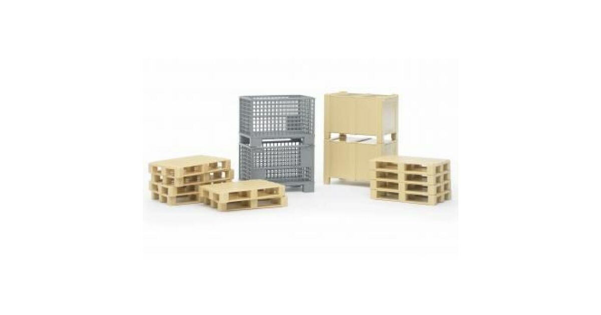 tároló és rakodó eszközök (2 rácsos doboz, 2 zárt láda, 10 db euro-raklap), 1:16 - Bruder leírása