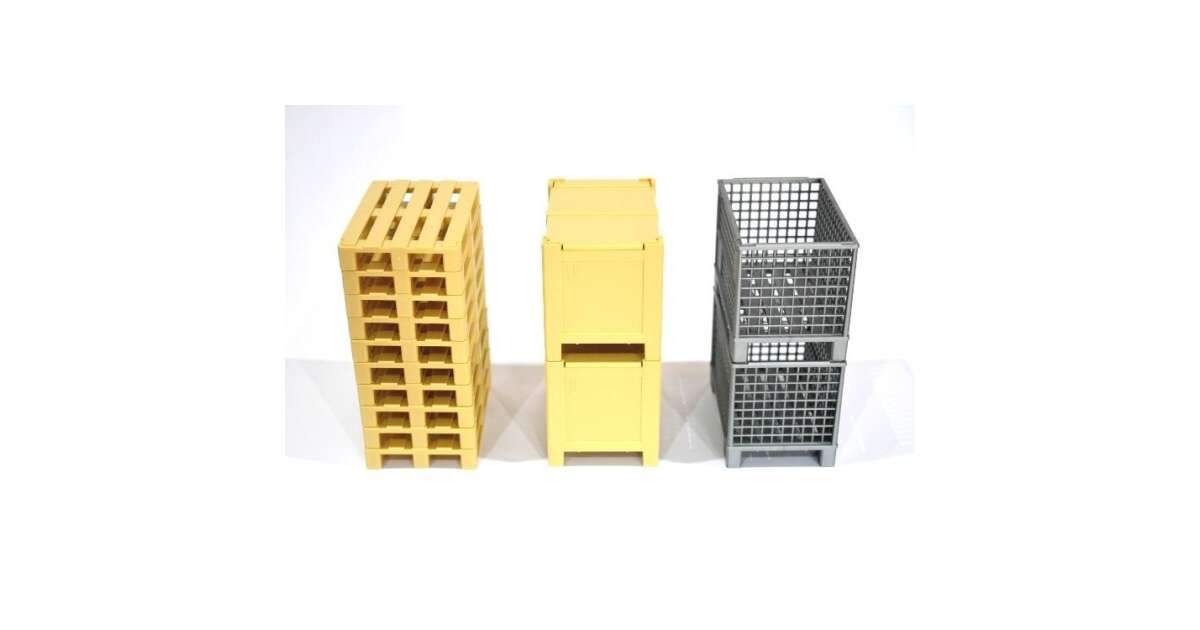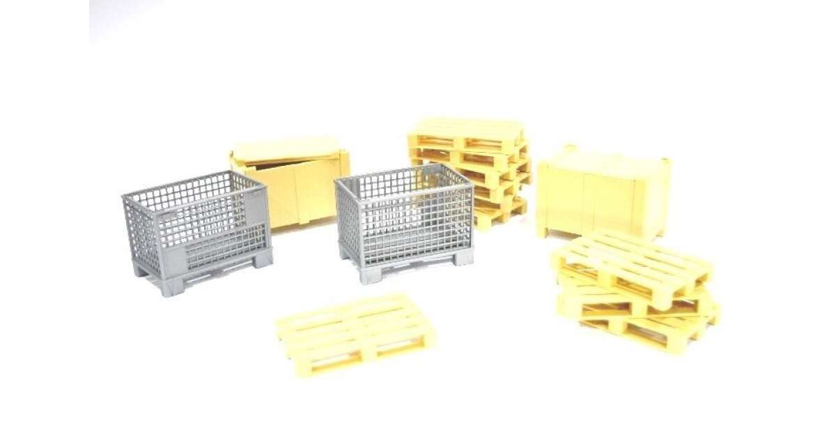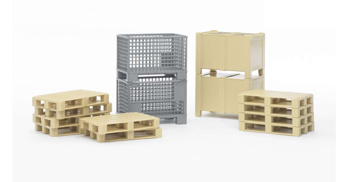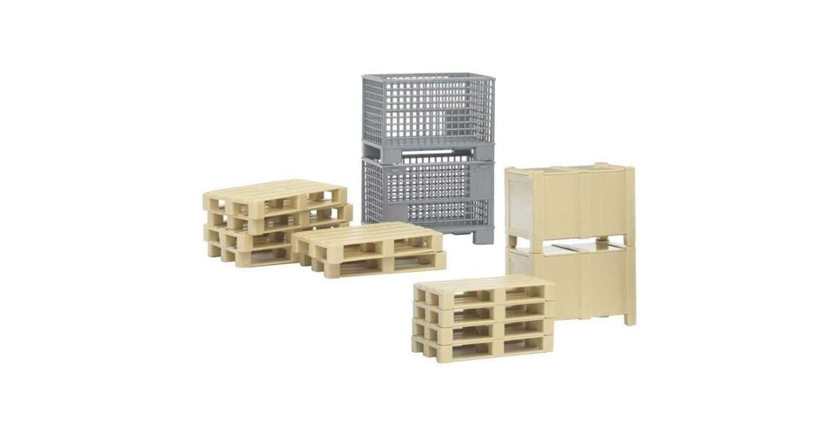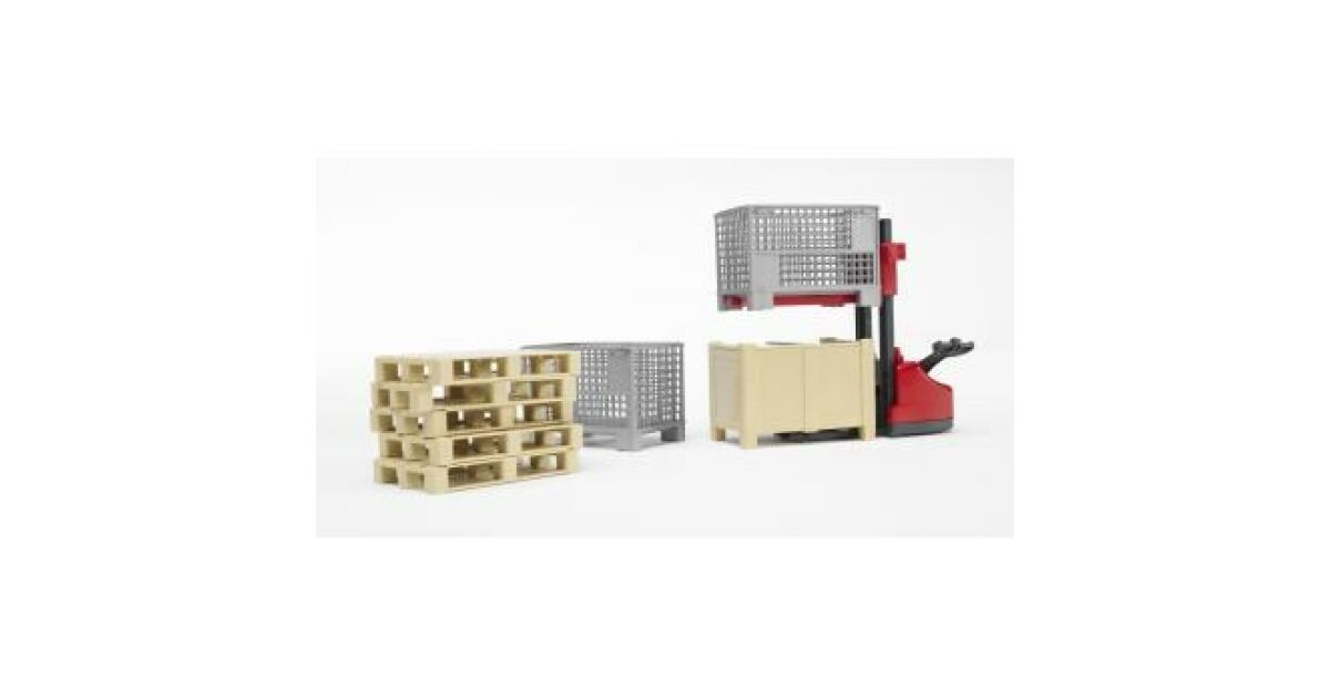 tároló és rakodó eszközök (2 rácsos doboz, 2 zárt láda, 10 db euro-raklap), 1:16 - Bruder leírása