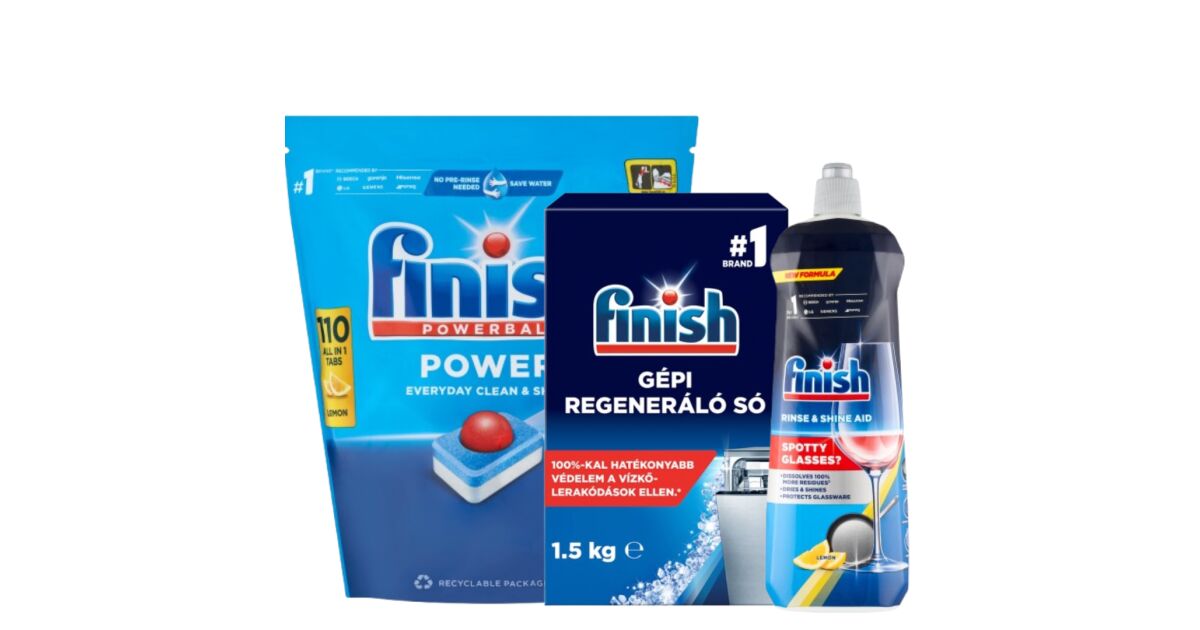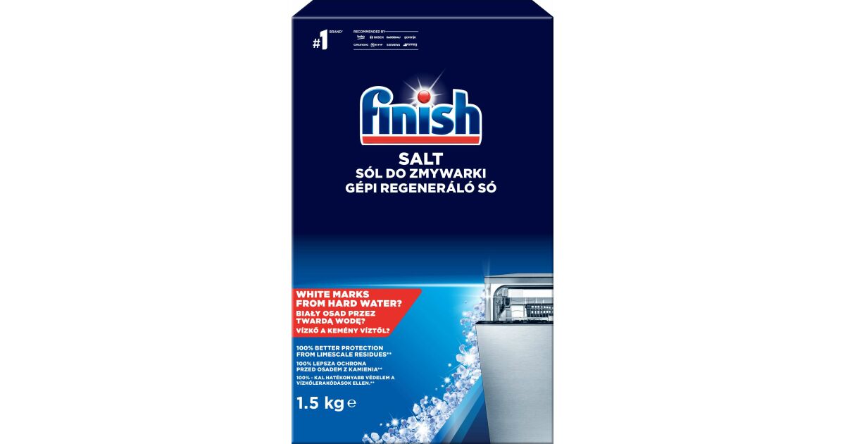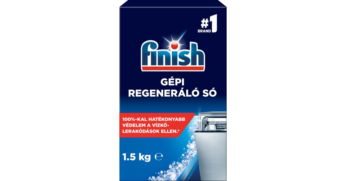 Finish gépi regeneráló só 1,5kg: Termék információk Finish gépi regeneráló só 100%-kal jobb mosogatógép védelem* mosogatógépének a Finish regeneráló sóval. A jobb mosogatógép-teljesítményért használjon Finish regeneráló sót a Finish mosogatószerekkel együtt. A kemény víz a rejtett részeken vízkőlerakódásokat okoz, ami csökkenti a mosogatógép mosási teljesítményét. A Finish regeneráló só 100%-kal jobb mosogatógép-védelmet* nyújt a víz lágyításával, megakadályozva a vízkőlerakódások kialakulását a mosogatógépben. Eltávolítja a foltokat és vízfoltokat az edényekről és poharakról is. *Vízkő esetén. Összehasonlítva a csak Finish All in 1 Max tablettával történő mosogatással, 50°C ECO + Vario Speed program, 21 °dH vízkeménység.