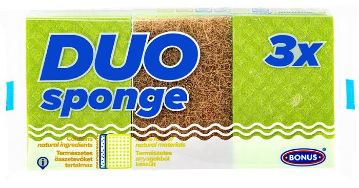 A BONUS Duo karcmentes mosogatószivacsa a dörzsi felület és a szivacsos kendő legjobb tulajdonságait egyesíti, hogy a mosogatás egyszerűbb és hatékonyabb legyen.