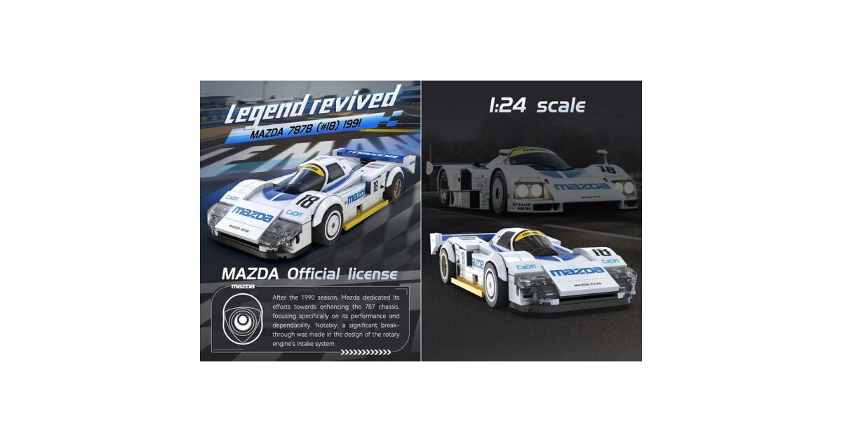 - Mazda 787B dizájn: Hűen reprodukálja az ikonikus versenyautó részleteit.