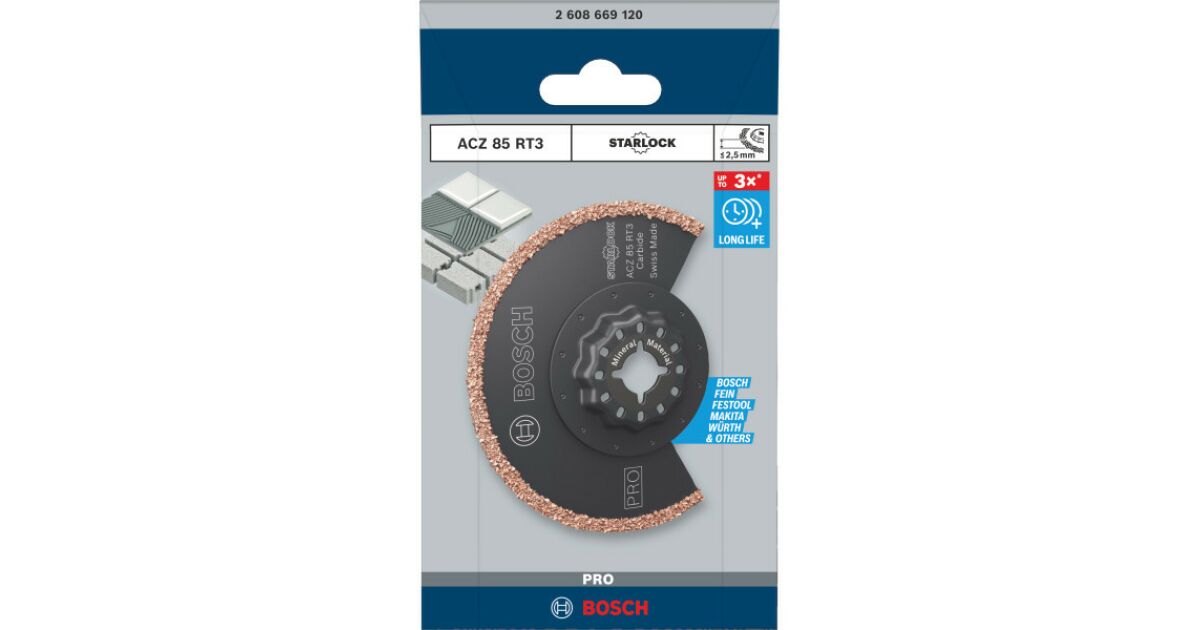 Ez a BOSCH PRO ACZ 85 RT3 karbidszemcsés fűrészlap tökéletes választás a régi fugák eltávolításához csempék károsítása nélkül. A kiváló minőségű keményfém szemcséknek köszönhetően hosszú élettartamú és nagyon hatékony, még kopásálló anyagok esetén is. Starlock rendszerének köszönhetően gyors és egyszerű a cseréje (mindössze 3 másodperc!).
