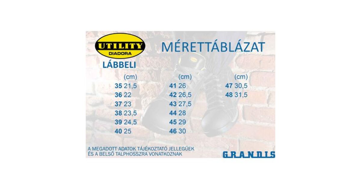 A megadott adatok tájékoztató jellegűek és a belső talphosszára vonatkoznak.