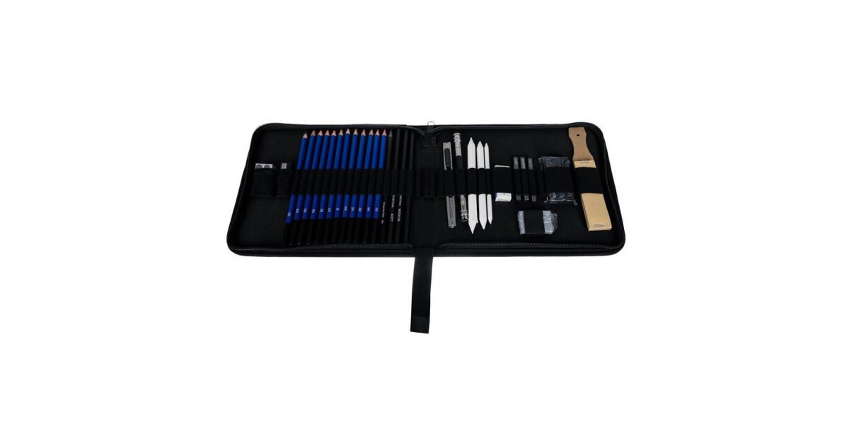 Ez a 32 elemből álló rajzkészlet minden szükséges eszközt tartalmaz a rajzolás és a művészi alkotás elkezdéséhez. Egy elegáns, fekete, cipzáras tokban érkezik, amelyben minden elemnek megvan a helye, így könnyen tárolható és szállítható. A védőgumiszalagok gondoskodnak arról, hogy minden a helyén maradjon.