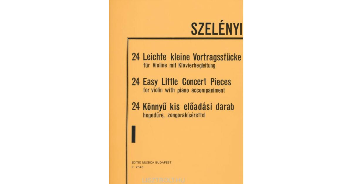 Ez a kiadvány Szelényi szerzeménye, amely 24 könnyű kis előadási darabot tartalmaz hegedűre és zongorakísérettel. Tökéletes választás kezdő és haladó hegedűsök számára, akik szeretnének változatos és élvezetes darabokat játszani.