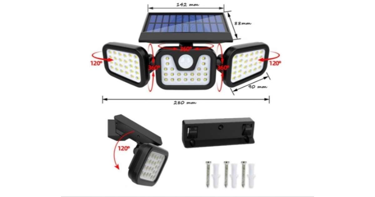 Mozgásérzékelős szolár tripla reflektor szürkületérzékelővel - forgatható fejjel leírása