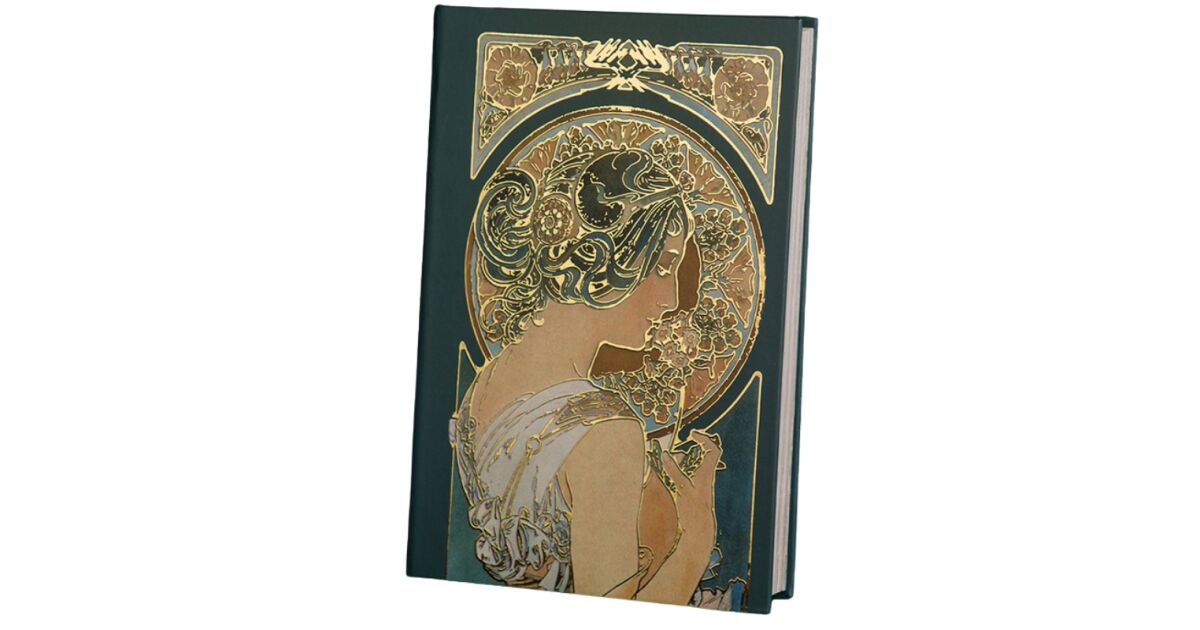 Mucha Primrose folyóirat, 256 illusztrált és vonalas oldal, varrott kötés, 128 x 188 mm, 100 g Daolin papír, szecessziós keménytáblás napirend, smaragdzöld vélemények