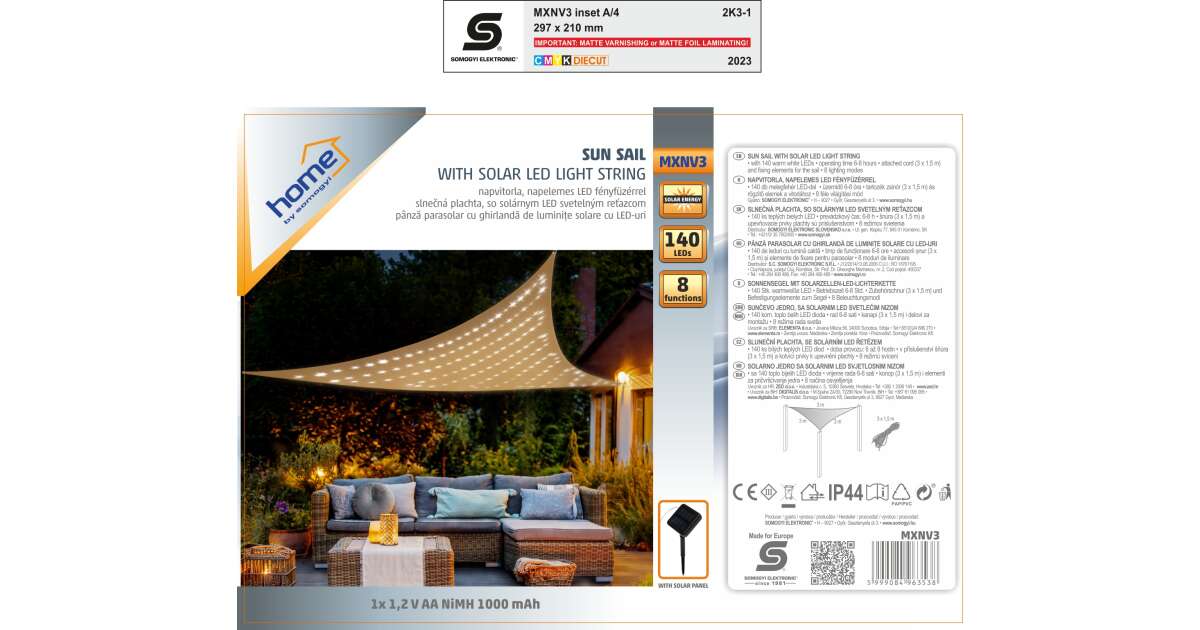 Home MXNV3 napvitorla, 140 LED, napelem, 8 program, IP44, polietilén HDPE, 1 x 1,2 V AA NiMH 1000 mAh akkumulátor, tartozék rögzítők, kül- és beltéri