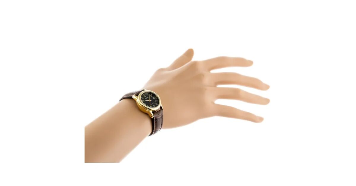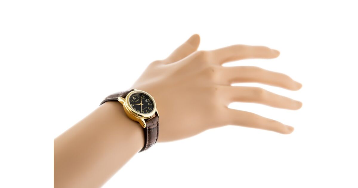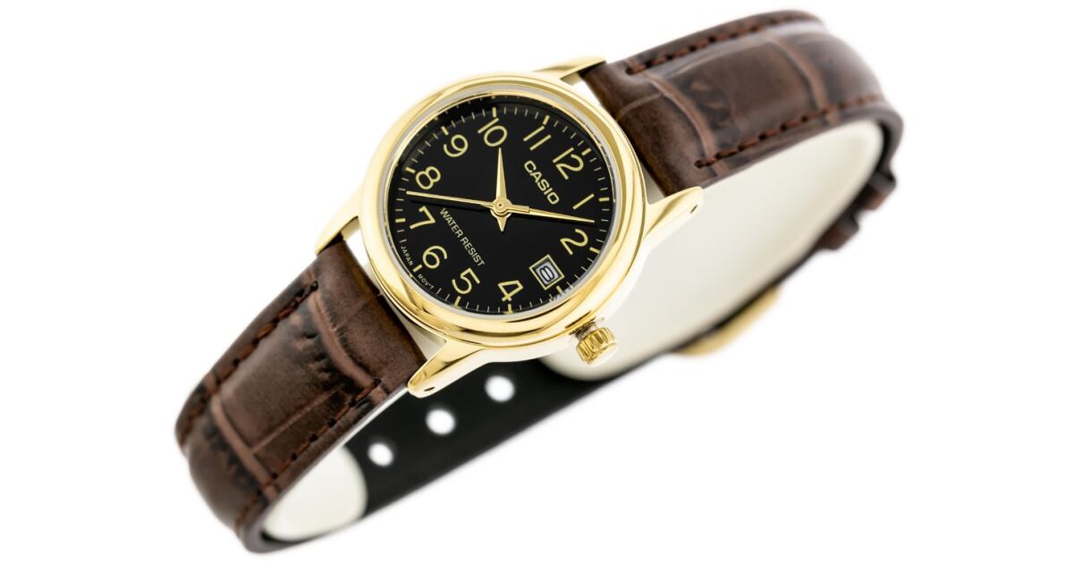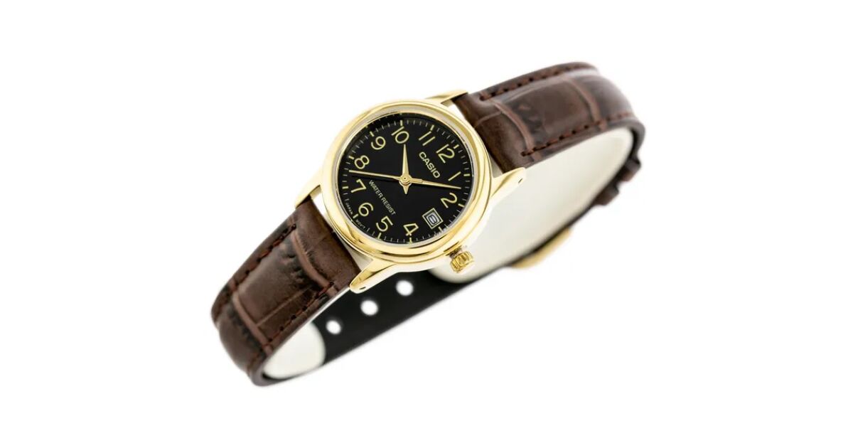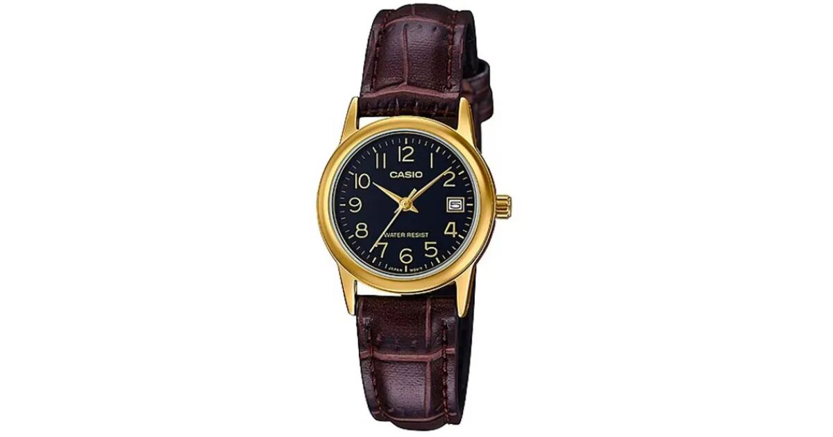 A Casio LTP-V002GL női karóra stílusos kiegészítője lehet mindennapi és alkalmi öltözékednek. Az aranyló rozsdamentes acéltok és a fekete számlap elegáns megjelenést kölcsönöz, míg a barna valódi bőrszíj kényelmes viseletet biztosít.
