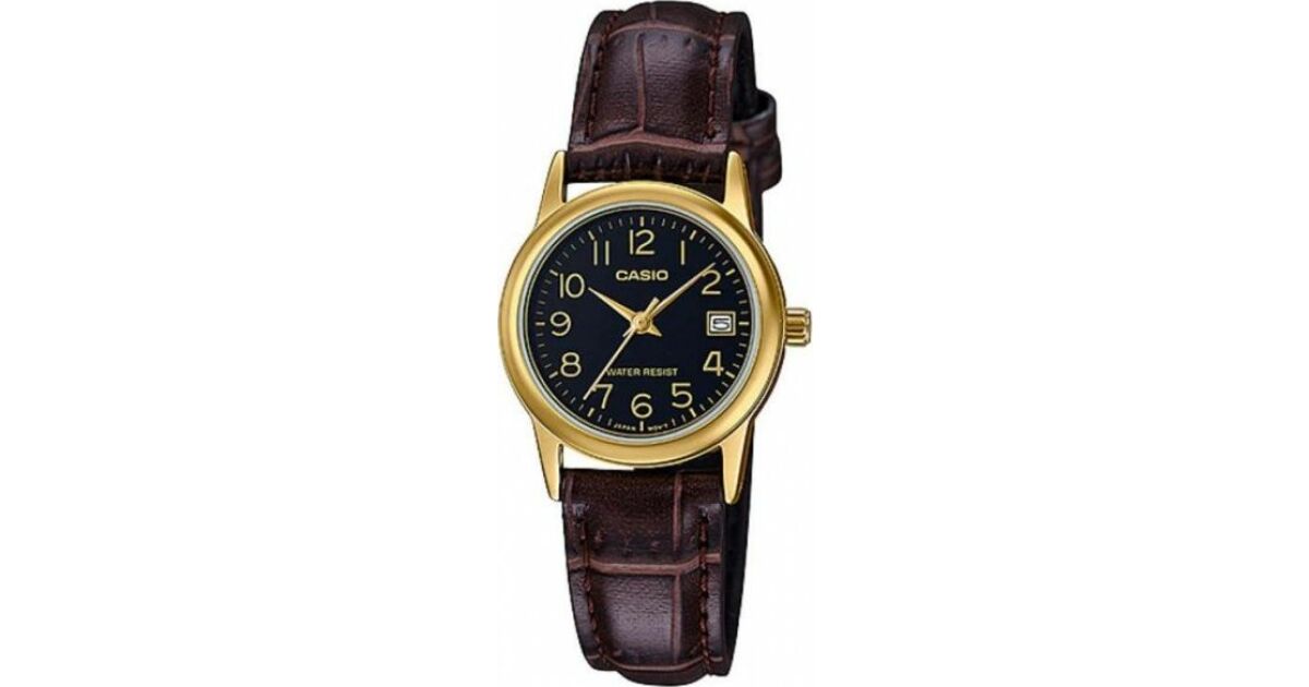 Casio LTP-V002GL női analóg karóra, fekete számlap, barna bőrszíj, WR30 vásárlás: