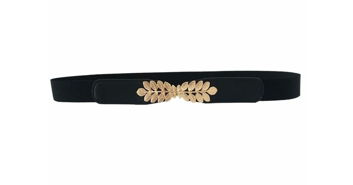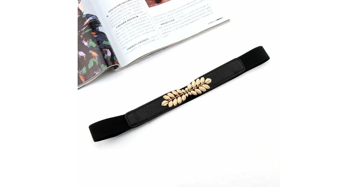 Ezt a terméket így is ismerheted: Elasztikus női ruhaöv fém levéllel, arany csattal, 61-103 cm