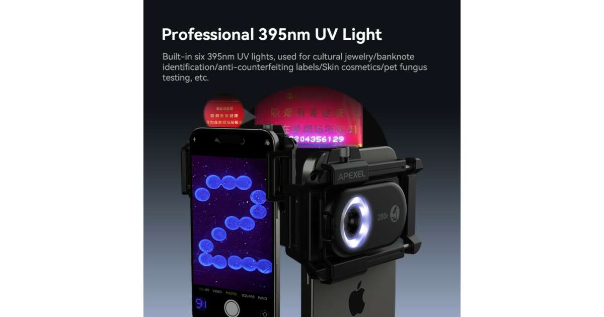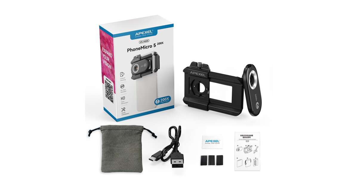 Ezt a terméket így is ismerheted: Mikroszkóp lencse, Apexel Phone Micro 5, zoom 200x, markolatrendszer iPhone 15, 14,13,12,11, Samsung S24/S23/S22, Huawei, Xiaomi, Oppo készülékekhez