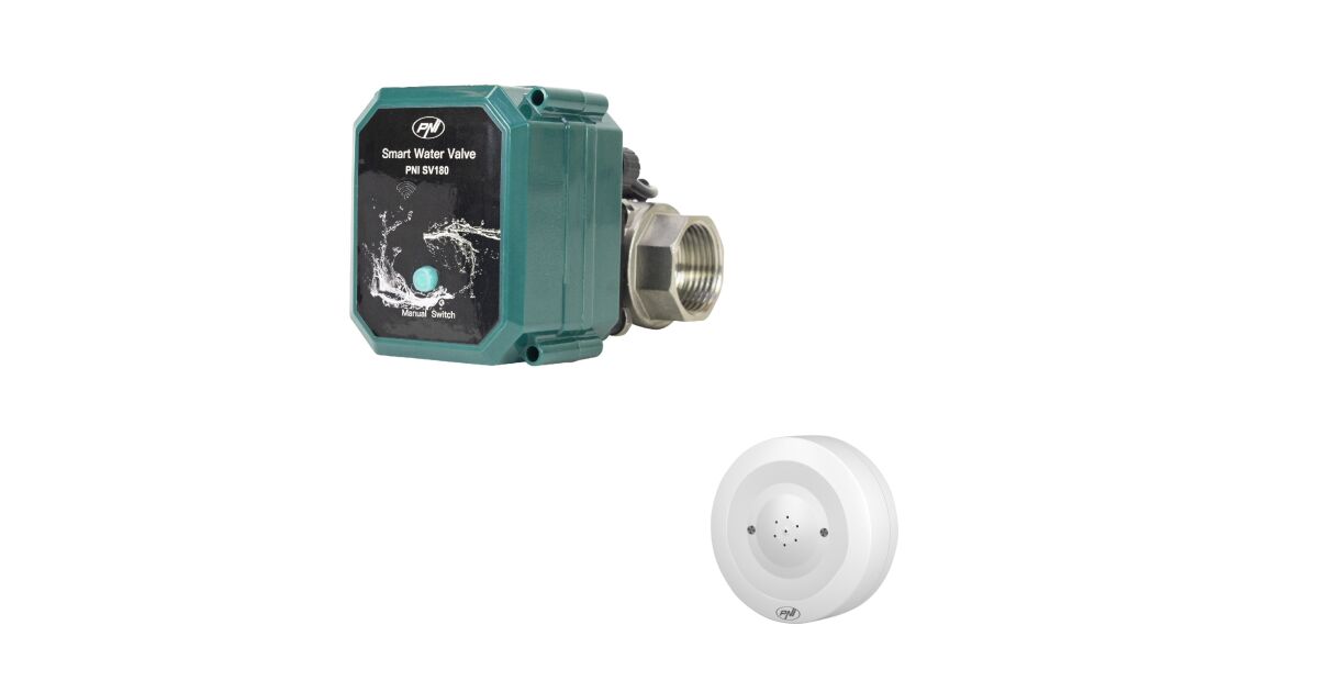 PNI SV180 Wi-Fi intelligens vízszelep, DN25 1 hüvelyk, IP65, árvízgátló készlet és PNI Safe House HS527 intelligens árvízérzékelő, 80dB