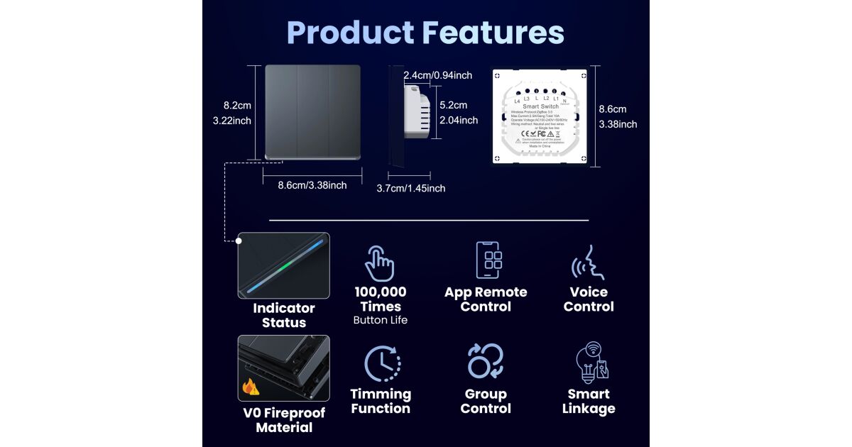 Élvezd az okosotthon kényelmét a Zadabso® intelligens fali kapcsolójával! Ez a stílusos, fekete kapcsoló lehetővé teszi a világítás távoli vezérlését okostelefonodról vagy hangutasításokkal. Kompatibilis az Alexa és a Google Home rendszerekkel, így a világítás irányítása sosem volt egyszerűbb.