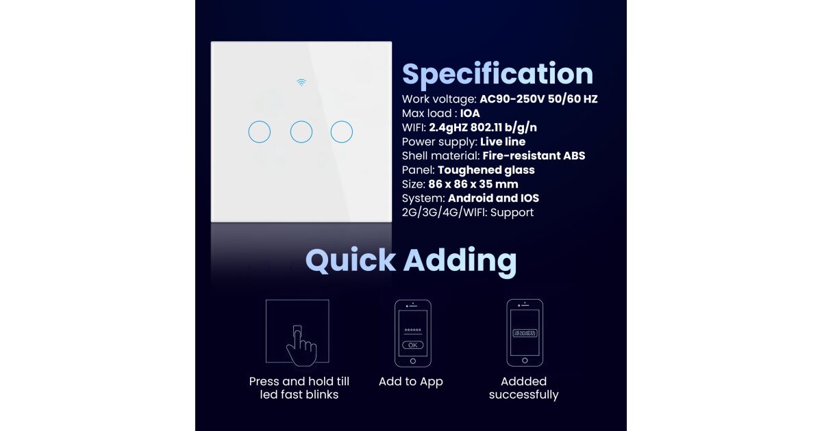 Szeretnél egy modern, kényelmes és intelligens otthont? A Zadabso® Smart WiFi érintőkapcsolóval könnyedén vezérelheted a világítást, bárhol is vagy! Ez a 3 csatornás okoskapcsoló elegáns üvegpanellel rendelkezik, kompatibilis az Alexa és a Google Assistant rendszerekkel, és RF433MHz-es távirányítóval is használható.