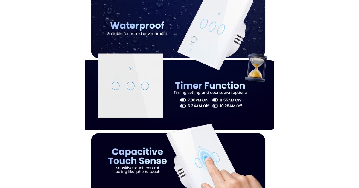 Ezt a terméket így is ismerheted: Zadabso® Smart WiFi intelligens kapcsoló érintéssel, 3 csatornával, üvegvédelem, Tuya/Smart Life, Alexa és Google kompatibilis, RF 433MHz, időzítő, fehér színű