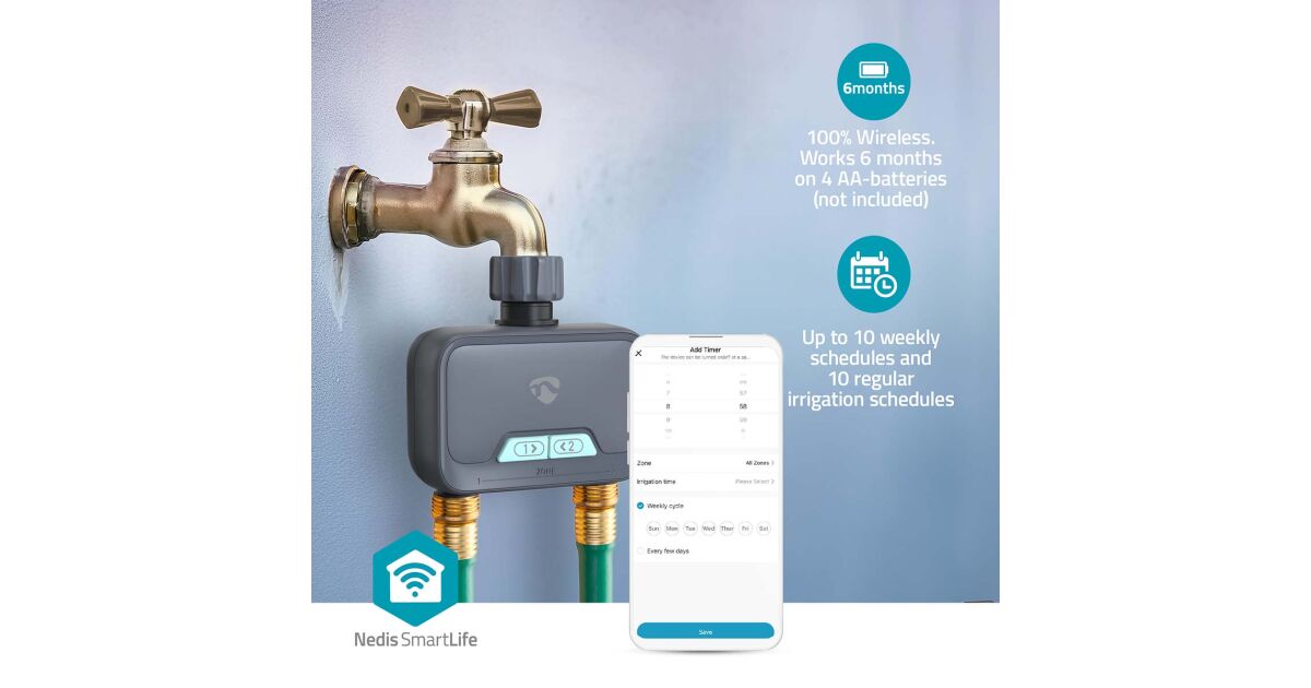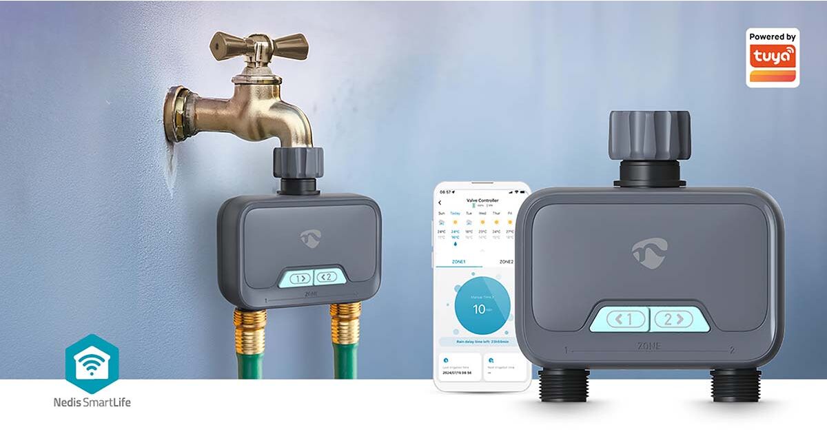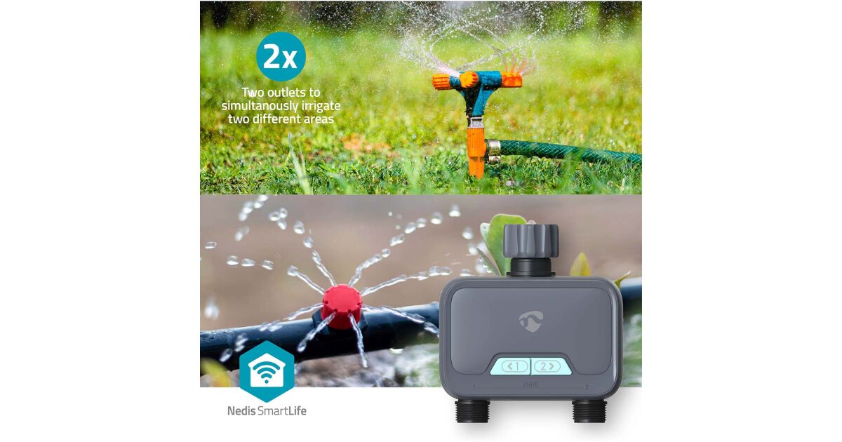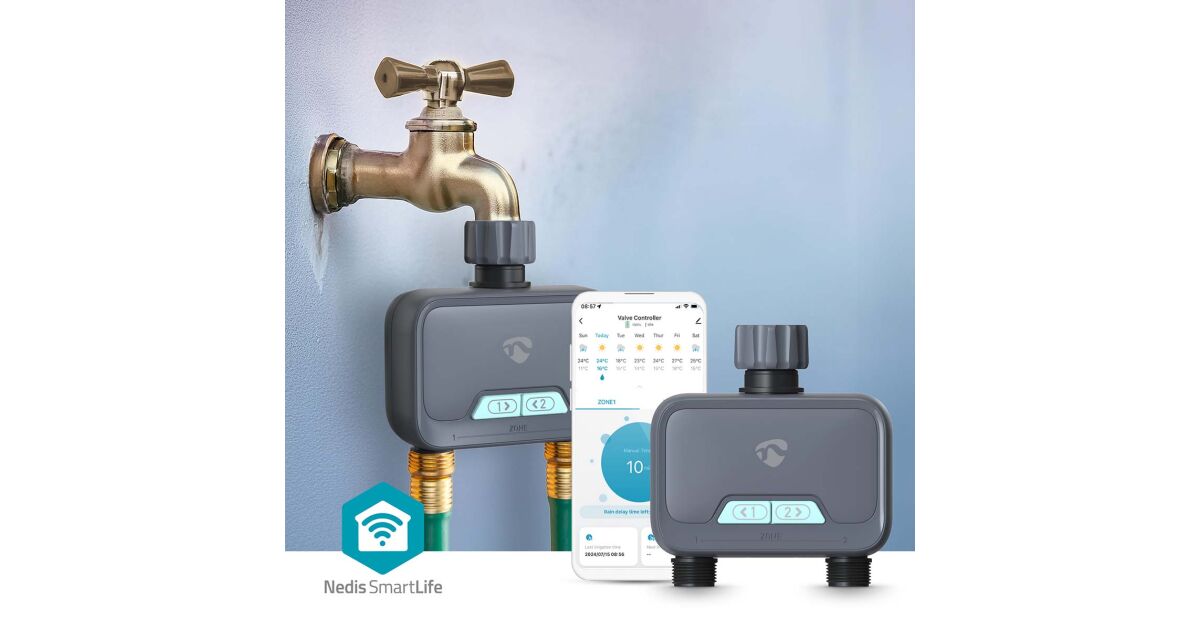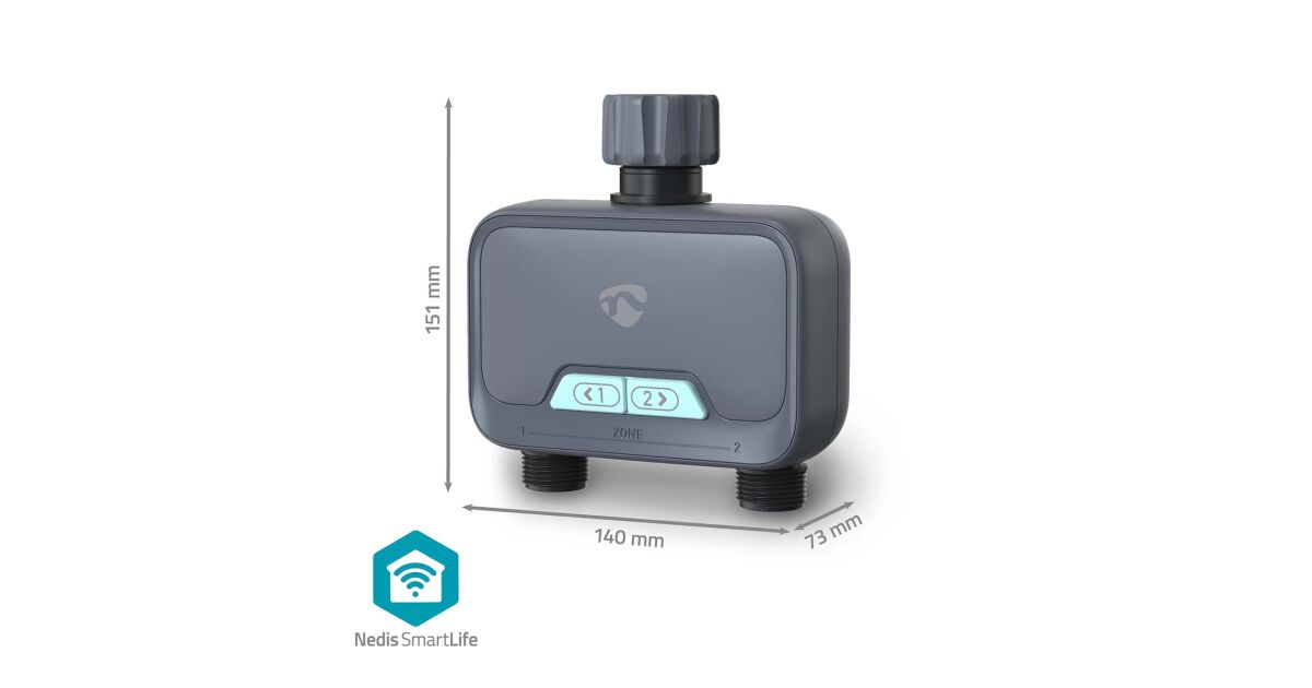 - Wi-Fi vezérlés (opcionális): A Nedis WIFIZBT10CWT átjáróval (külön megvásárolható) Wi-Fi-hez csatlakoztatható, így távolról is vezérelheti az öntözést. 🌐