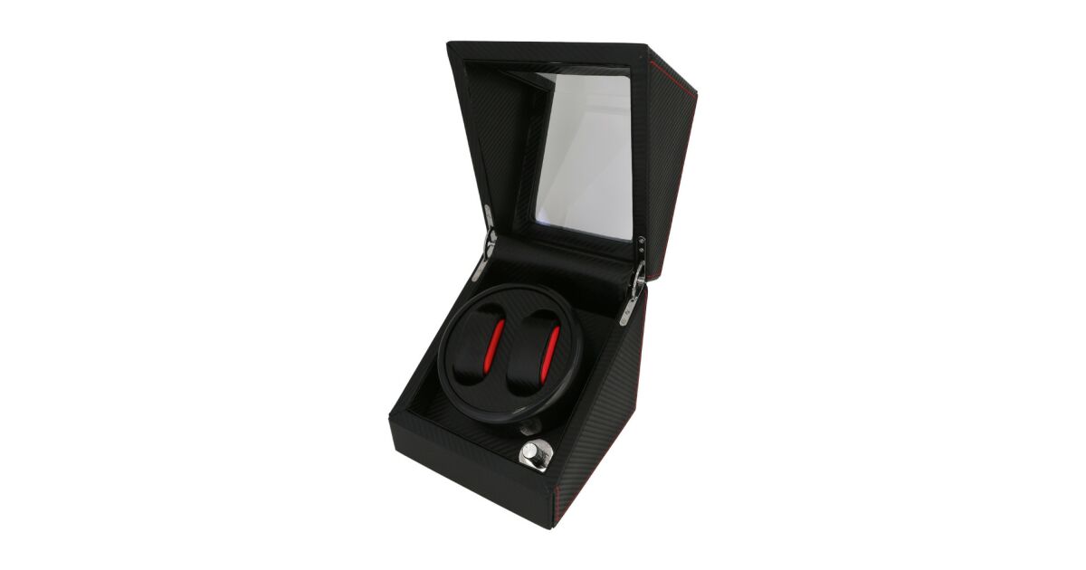 Ez a stílusos óraforgató doboz tökéletes megoldás az automata karórák tárolására és karbantartására. A fekete műbőr borítás piros varrással kifinomult megjelenést kölcsönöz, míg a fekete textil belső biztosítja az órák biztonságát.