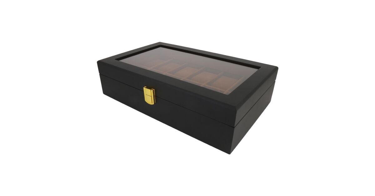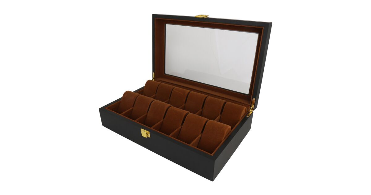 Óratartó doboz, 12 db karórához, kívül fekete színű festett fa felület, belül barna textil borítás vélemények