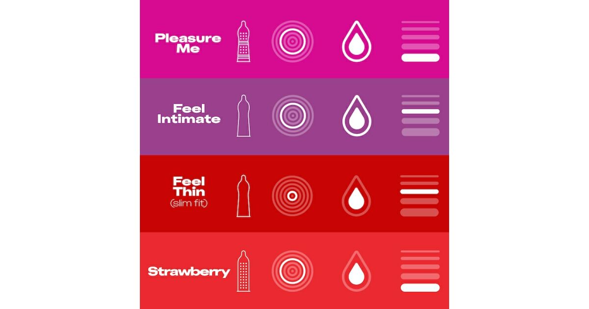 Széleskörű, stimuláló érzéseket kínál, amelyek illeszkednek a hangulatodhoz! 4 féle természetes gumilatex óvszer (egyenként 10 darab) a hihetetlenül szórakoztató érzésekért: Eper a gyümölcsös csemegéért, Pleasure Me bordázott és kiemelkedő pontokkal a még élvezetesebb élményért; Feel Intimate extra síkosítóval a közelebbi érzésért; és Feel Ultra Thin, a szupervékony óvszereink a még intenzívebb érzésekért.