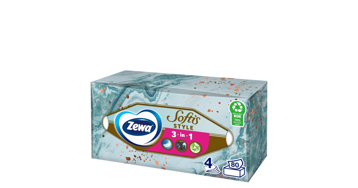 Ezt a terméket így is ismerheted: Zewa Softis Style 4 rétegű dobozos Papír zsebkendő 3x80db