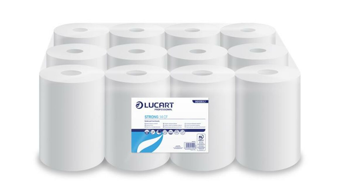 Törlőkendő, tekercses, belső adagolású, 2 rétegű, LUCART "Strong 14 CF", hófehér