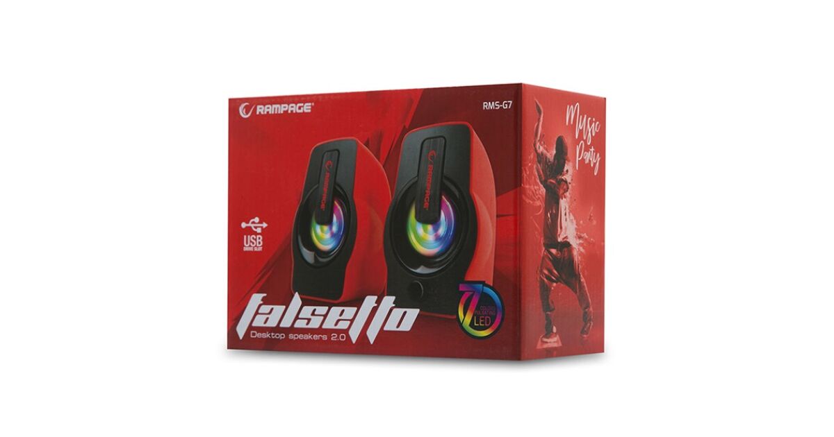 A Rampage RMS-G7 Falsetto 2.0 hangszórók tökéletes választás, ha kiváló hangminőségre és látványos megjelenésre vágysz. Kompakt méretüknek köszönhetően ideálisak asztali használatra, miközben RGB LED világításukkal feldobják a hangulatot.